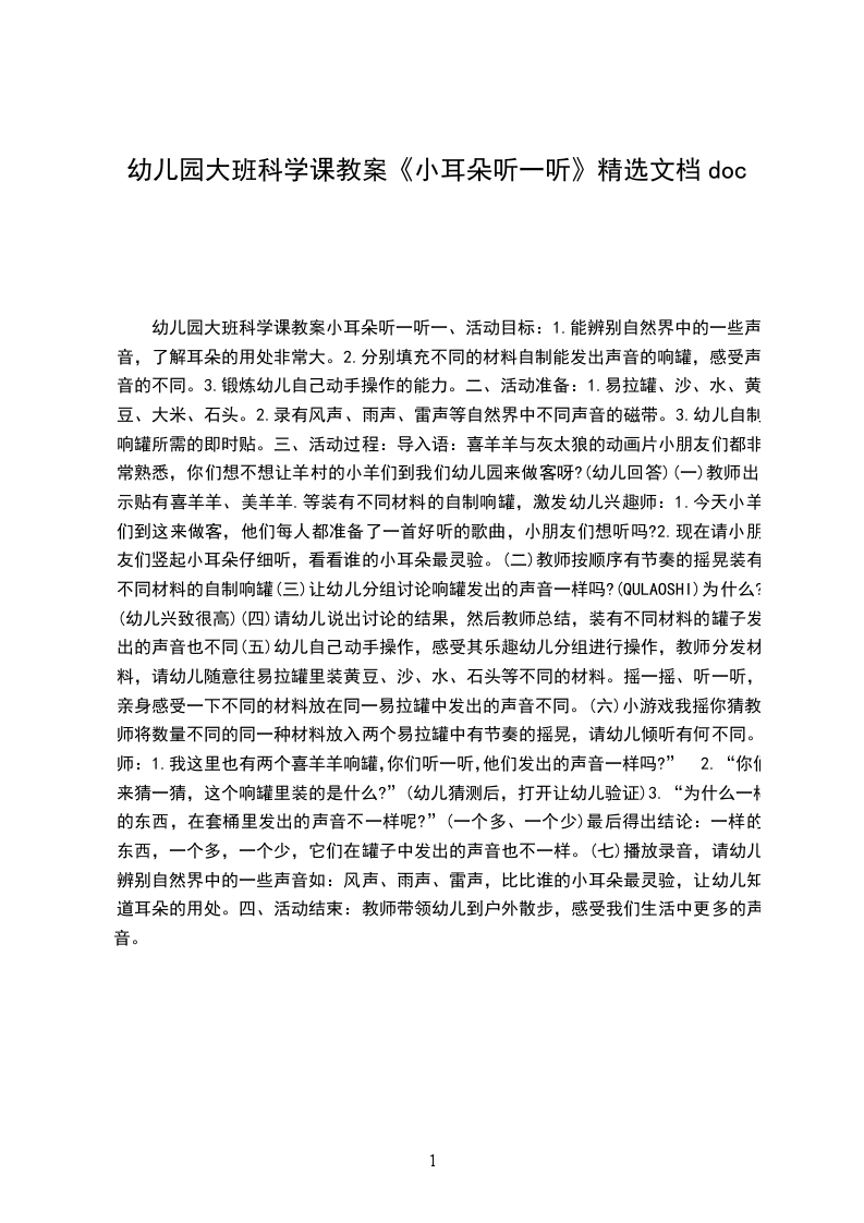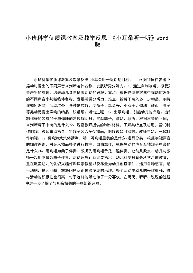 小班科学优质课教案小耳朵听一听幼儿园小班科学教案:小耳朵听一听活动要求:1通过操作活动,学习听辨各种东西发出的声音并能用语言表达。2发展幼儿的听辨能力及口语表达能力,提高幼儿的注意力。活动准备:1各种饮料瓶子人手一份,分别装着硬币、木珠、纸屑、米。2打击乐器若干。3四张桌子分别布置成小狗、小兔、小鸡、小鸭家。4录音机一台及有关录音带。