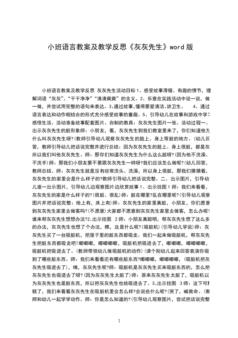 一、出示灰灰先生的脏形象师:小朋友,看,灰灰先生到我们教室里来了,你们知道他为什么叫灰灰先生呀?(教师引导幼儿观察灰灰先生的脸上、身上等脏的地方。(幼儿回答,教师引导幼儿把话说完整并进行总结:因为灰灰先生的脸上、身上很脏,都是灰,所以我们叫他灰灰先生。师:那你们知道灰灰先生为什么这么脏呀?(因为他不洗澡、不洗手)师:那我们小朋友要不要跟灰灰先生一样呀?我们应该怎么做呢?(幼儿回答,教师总结。师:灰灰先生就是没有经常洗头、洗澡,所以身上很脏,那我们猜猜看,灰灰先生的家里会是什么样子的?教师引导幼儿把话说完整。
