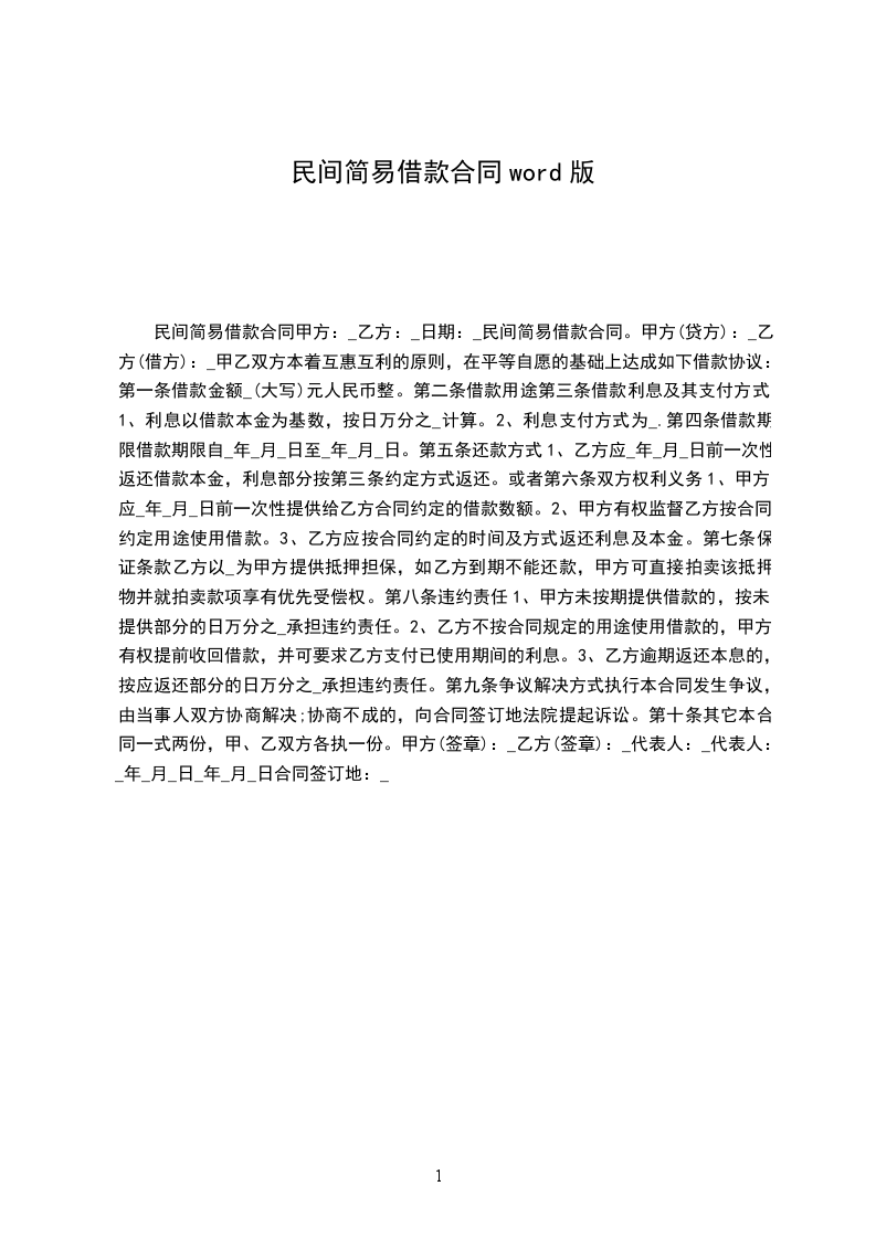 民间简易借款合同甲方:_乙方:_日期:_民间简易借款合同。甲方(贷方):_乙方(借方):_甲乙双方本着互惠互利的原则,在平等自愿的基础上达成如下借款协议: