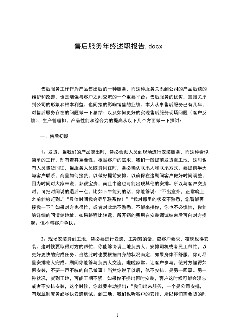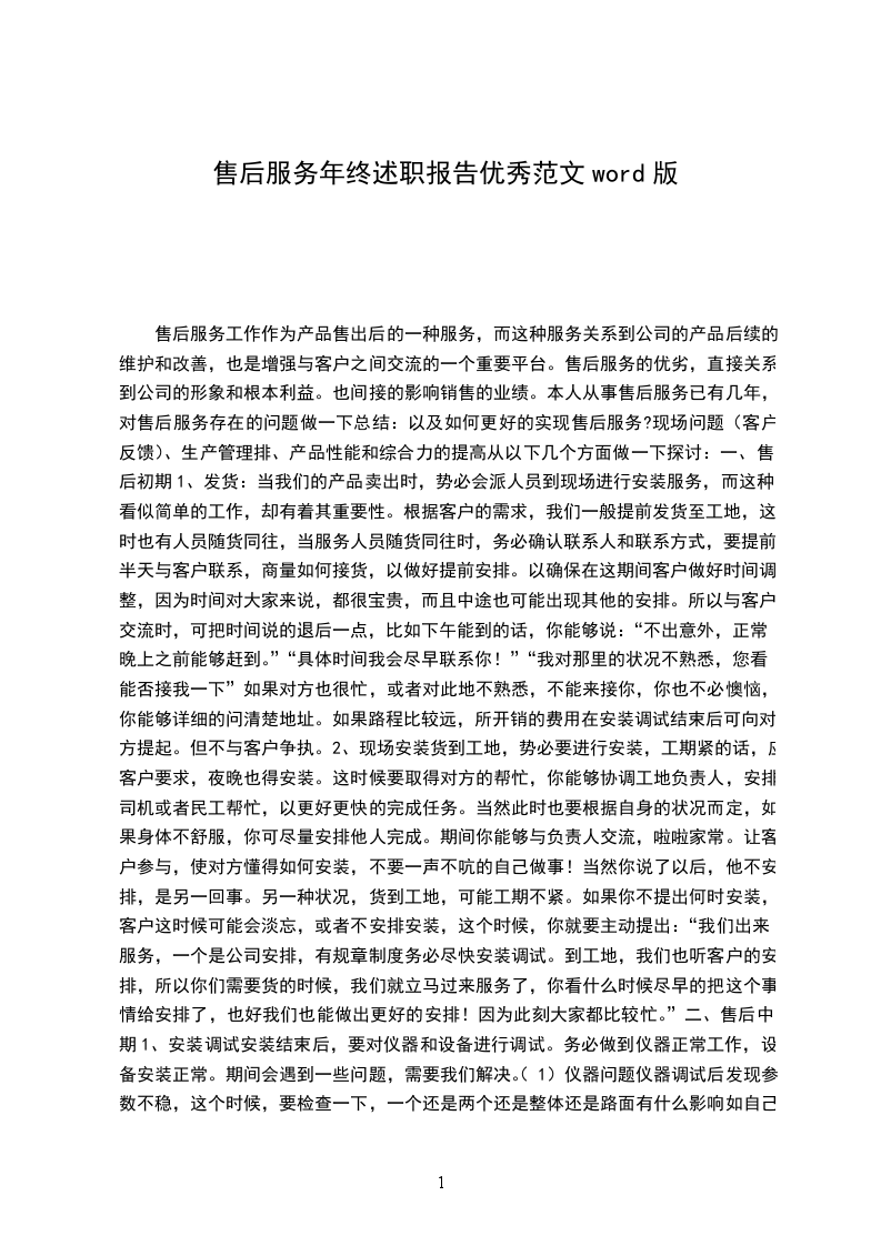 三、售后尾声针对售后服务的工作,在此我想做一下总结:售后服务是一项很重要的工作,也是继销售的一个重要的延续工作,做好了,能够增加销售的机会。做不好,也能够毁掉一个关系网。所以从事售后服务首先要了解这个行业的方方面面。我们售后服务的是一个启下承上的工作,一方面要与最底层的接触,另一方面也要和中层甚至高层接触。我们的服务身份不会变,但我们要换一种角度和形象和对方交流!