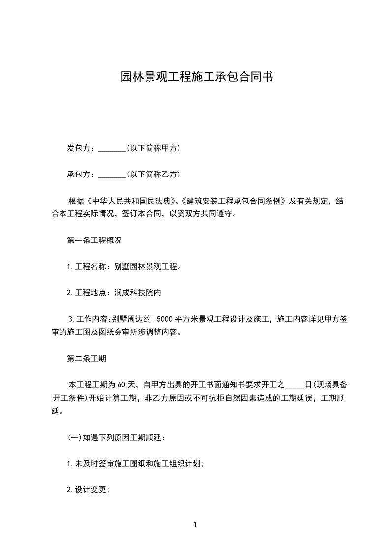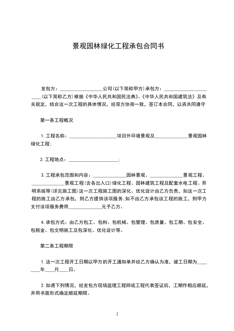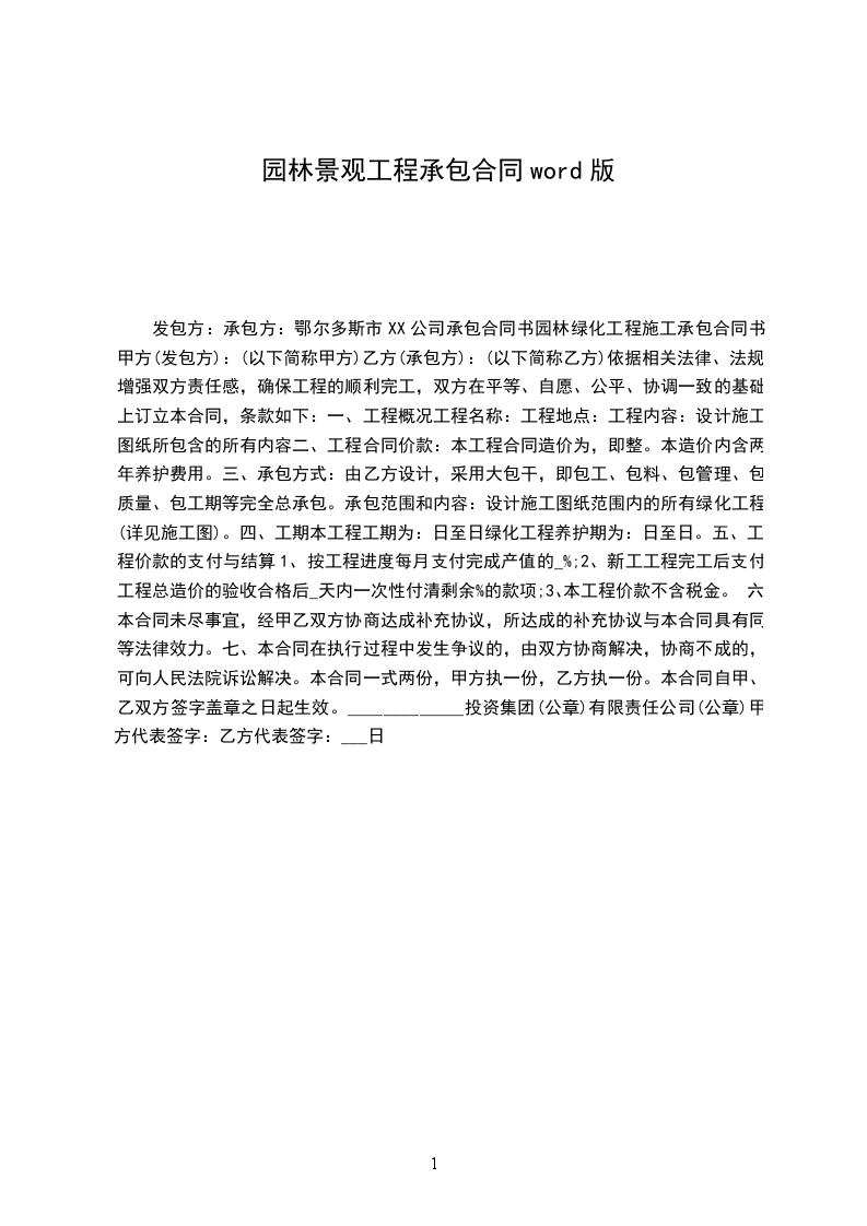 发包方:承包方:鄂尔多斯市XX公司承包合同书园林绿化工程施工承包合同书甲方(发包方):(以下简称甲方)乙方(承包方):(以下简称乙方)依据相关法律、法规,增强双方责任感,确保工程的顺利完工,双方在平等、自愿、公平、协调一致的基础上订立本合同,条款如下: