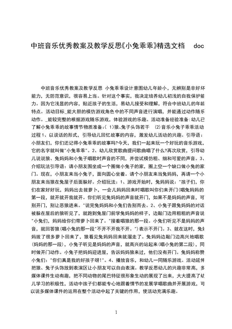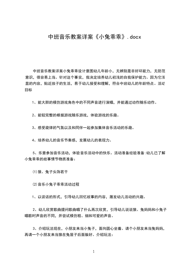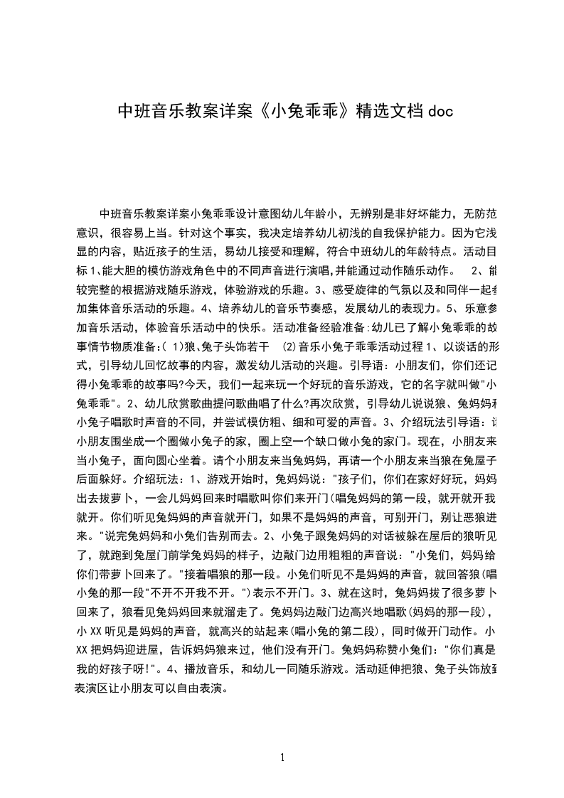 中班音乐教案详案小兔乖乖设计意图幼儿年龄小,无辨别是非好坏能力,无防范意识,很容易上当。针对这个事实,我决定培养幼儿初浅的自我保护能力。因为它浅显的内容,贴近孩子的生活,易幼儿接受和理解,符合中班幼儿的年龄特点。活动目标