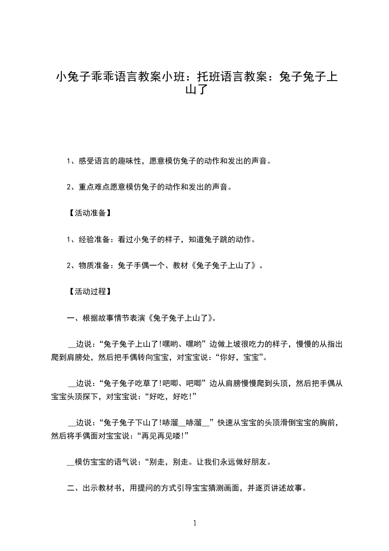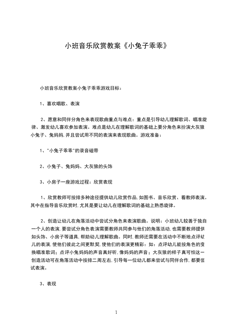 5、乐意参加音乐活动,体验音乐活动中的快乐。活动准备经验准备:幼儿已了解小兔乖乖的故事情节物质准备: