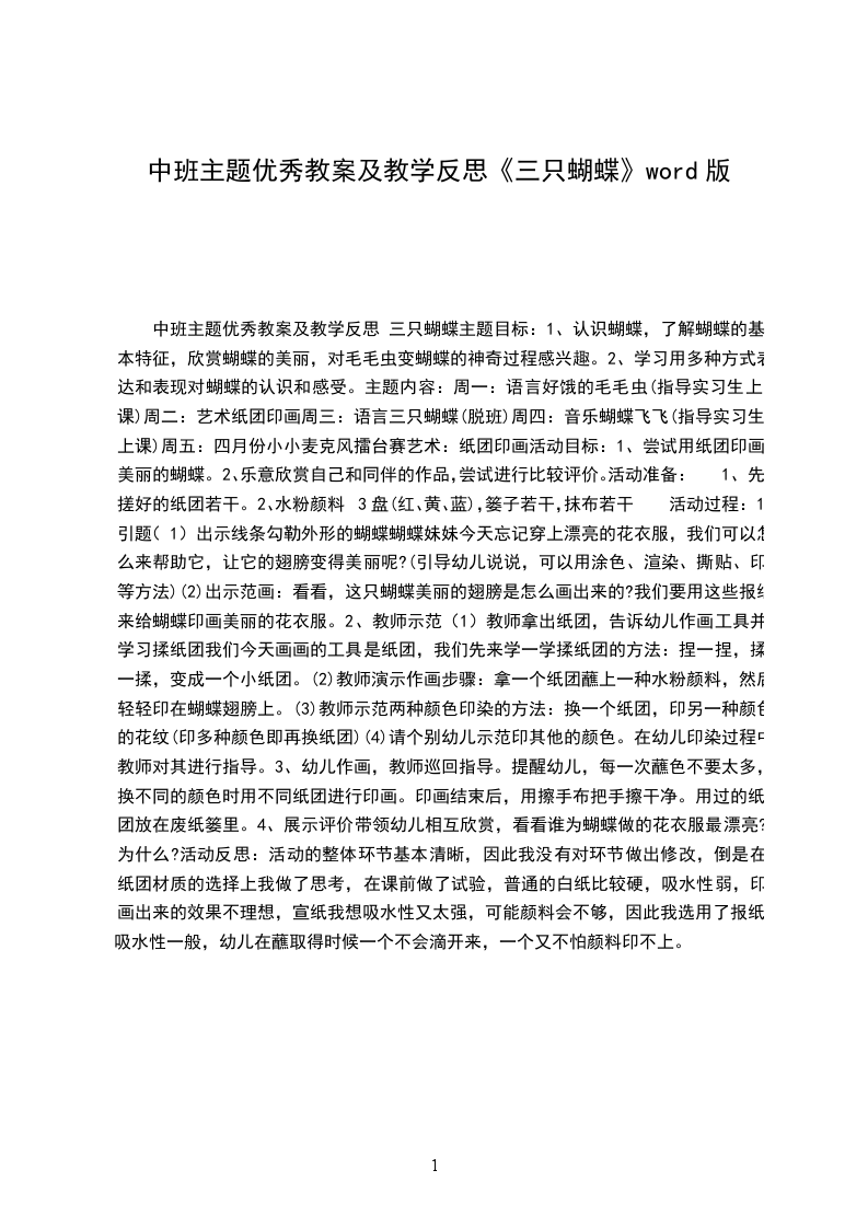 (2)出示范画:看看,这只蝴蝶美丽的翅膀是怎么画出来的?我们要用这些报纸来给蝴蝶印画美丽的花衣服。
