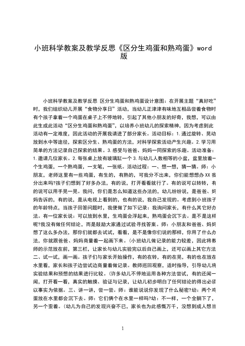 小班科学教案及教学反思 区分生鸡蛋和熟鸡蛋设计意图:在开展主题“真好吃”时,我们组织幼儿开展“食物分享日”活动,当幼儿正津津有味地互相品尝着食物时,有个孩子拿着一个鸡蛋在桌子上不停地转,引起了其他小朋友的好奇,我想,可以由此生成此活动“区分生鸡蛋和熟鸡蛋”,以培养小班幼儿的探索精神,因为考虑到此活动有一定难度,因此活动的开展我请进了部分家长。活动目标: