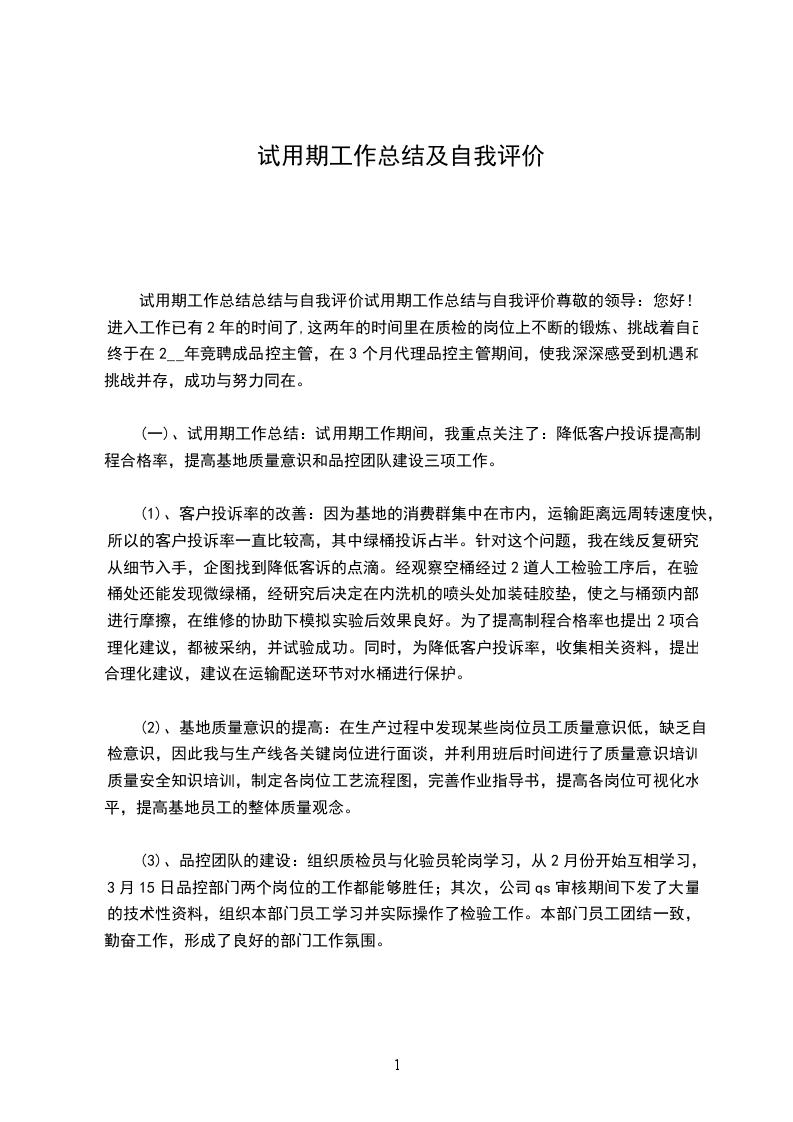 试用期工作总结总结与自我评价试用期工作总结与自我评价尊敬的领导:您好!进入工作已有2年的时间了,这两年的时间里在质检的岗位上不断的锻炼、挑战着自己,终于在2__年竞聘成品控主管,在3个月代理品控主管期间,使我深深感受到机遇和挑战并存,成功与努力同在。
