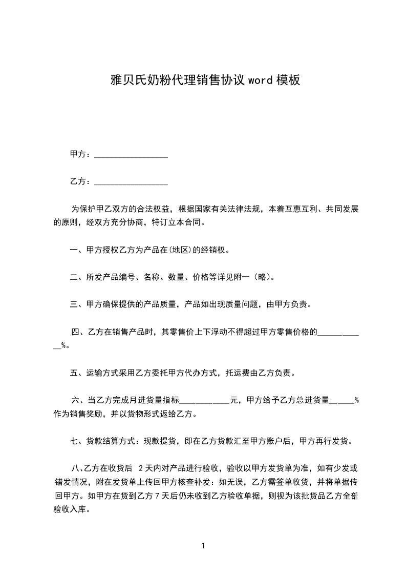 六、当乙方完成月进货量指标____________元,甲方给予乙方总进货量______%作为销售奖励,并以货物形式返给乙方。