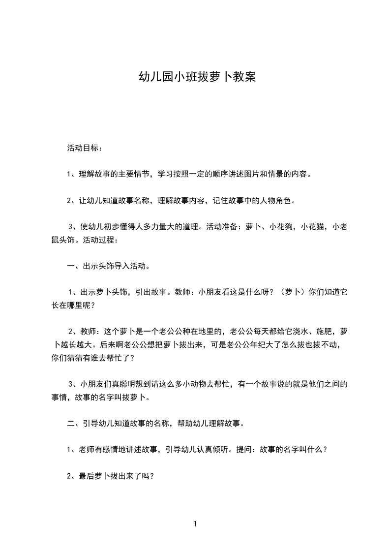 5.表演完后向幼儿提问:"萝卜是谁拔出来的?"请幼儿回答。五.教师小结。告诉幼儿人多力量大的道理,只有团结合作才能拔起萝卜教学反思通过上拔萝卜使孩子们的兴趣很浓厚,课堂气氛十分活跃,孩子的参与意识很强,表达能力也比较清楚。在故事中幼儿领悟到"人多力量大"这样一个道理,活动结束时,有些孩子意犹未尽,由于活动时间有限,孩子们中能被老师叫起来表演的人只有少数。活动后,请幼儿到外面自由表演或创编。我觉得以后的语言活动,我应多加一些表演活动,让每一个有人都能展示自己,这样既可以锻炼孩子的表演和表达能力,同时也增强了孩子们的自信心。让孩子们懂得有些事情光一个人努力是不行的,大家要团结合作,才能做成一个人不能做成的事情。一个人是要努力锻炼自己的生活本领,像老公公那样,种的萝卜比别人的个儿大,与其他人友好相处,在遇到困难的时候,像"拔XX"那样一个帮一个,在以后的学习和生活中应该团结合作,这节课中有得有失,我觉得准备还不充分,有些幼儿较小,理解能力有限,大多数幼儿都会表演拔XX,以后我会吸取这节的教学,让以后的教学能更好!