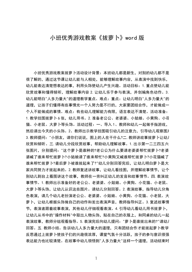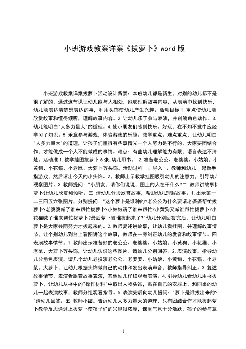 小班游戏教案详案拔萝卜活动设计背景:本班幼儿都是新生,对别的幼儿都不是很了解的,通过这节课让幼儿能与人相处,能够理解故事内容,从表演中找到快乐,幼儿能表达清楚想表达的事,利用头饰使幼儿产生兴趣。活动目标