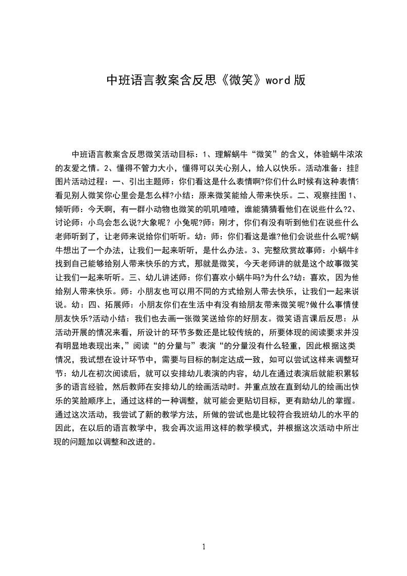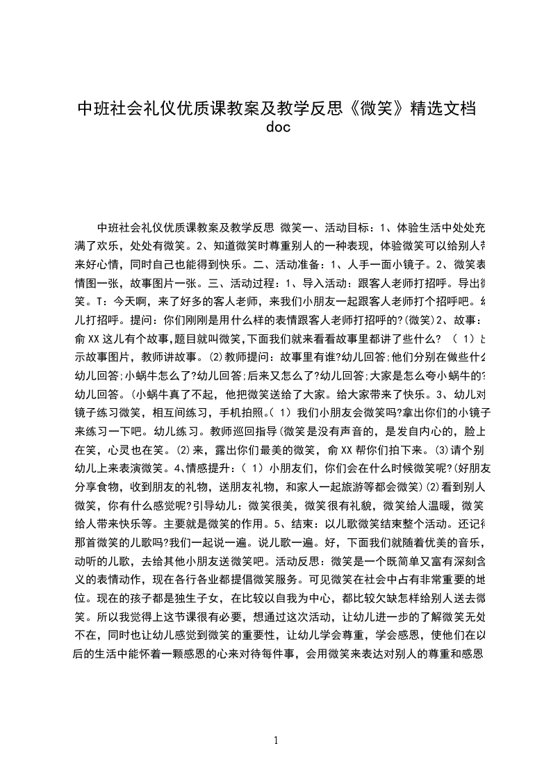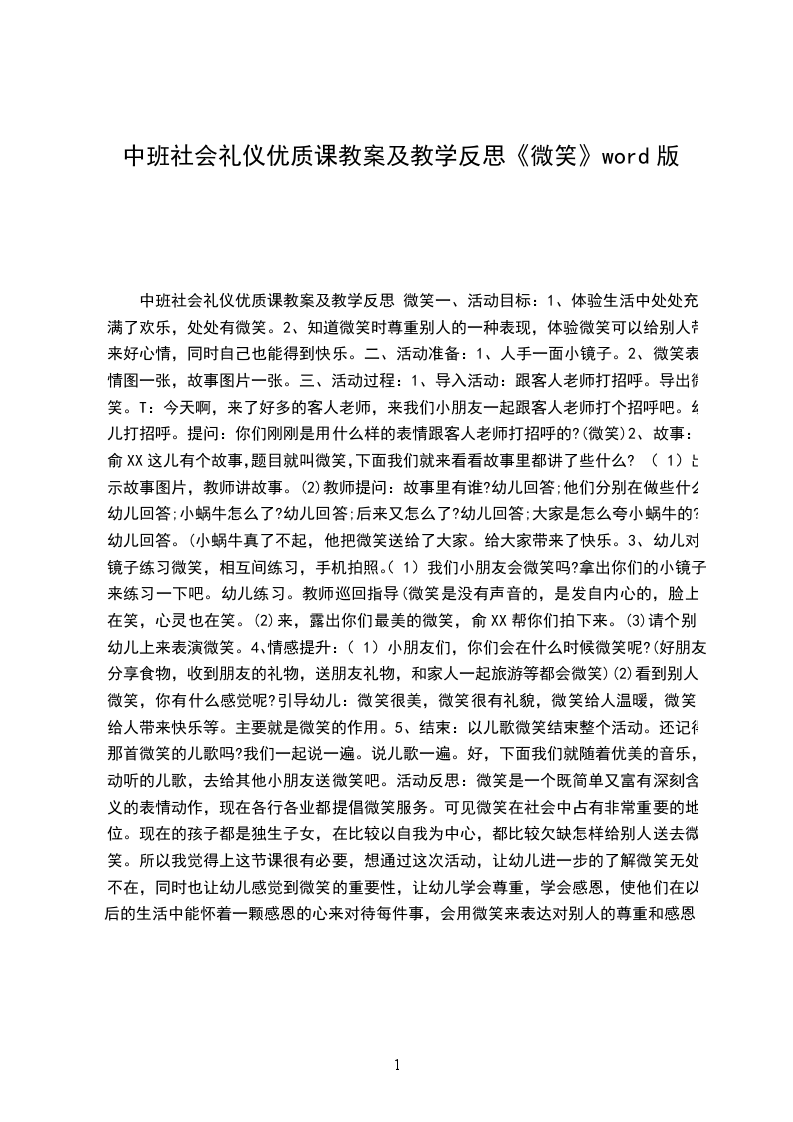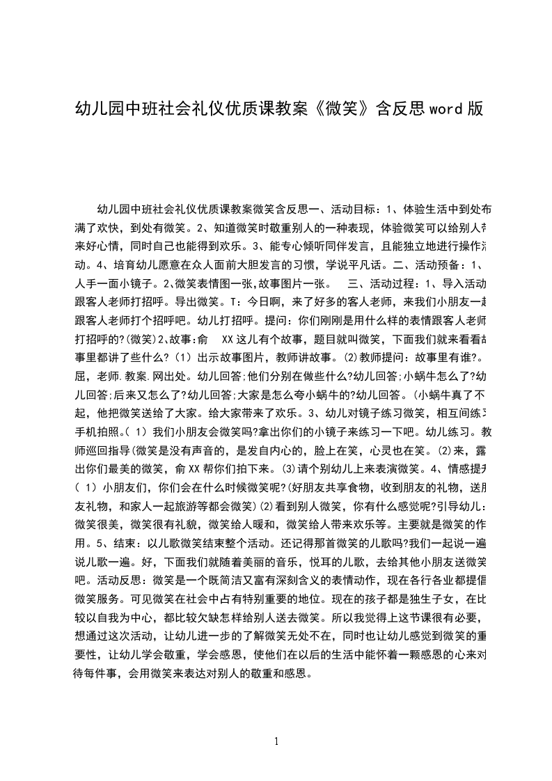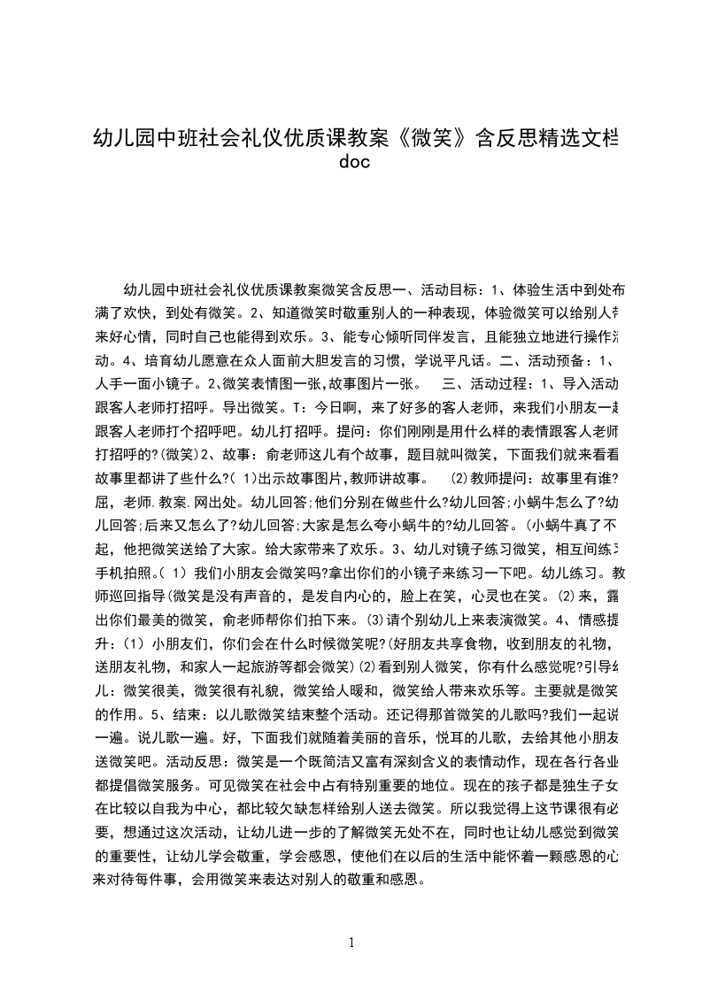 5、结束:以儿歌微笑结束整个活动。还记得那首微笑的儿歌吗?我们一起说一遍。说儿歌一遍。好,下面我们就随着美丽的音乐,悦耳的儿歌,去给其他小朋友送微笑吧。活动反思:微笑是一个既简洁又富有深刻含义的表情动作,现在各行各业都提倡微笑服务。可见微笑在社会中占有特别重要的地位。现在的孩子都是独生子女,在比较以自我为中心,都比较欠缺怎样给别人送去微笑。所以我觉得上这节课很有必要,想通过这次活动,让幼儿进一步的了解微笑无处不在,同时也让幼儿感觉到微笑的重要性,让幼儿学会敬重,学会感恩,使他们在以后的生活中能怀着一颗感恩的心来对待每件事,会用微笑来表达对别人的敬重和感恩。