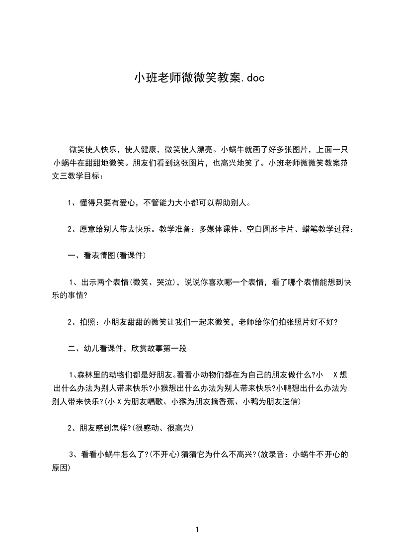 2、知道微笑时敬重别人的一种表现,体验微笑可以给别人带来好心情,同时自己也能得到欢乐。