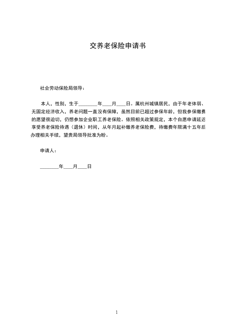 本人,性别,生于________年____月____日。属杭州城镇居民,由于年老体弱、无固定经济收入,养老问题一直没有保障,虽然目前已超过参保年龄,但我参保缴费的愿望很迫切,仍想参加企业职工养老保险。依照相关政策规定,本个自愿申请延迟享受养老保险待遇(退休)时间,从年月起补缴养老保险费,待缴费年限满十五年后办理相关手续,望贵局领导批准为盼。