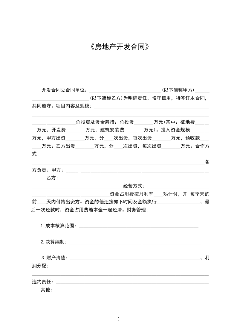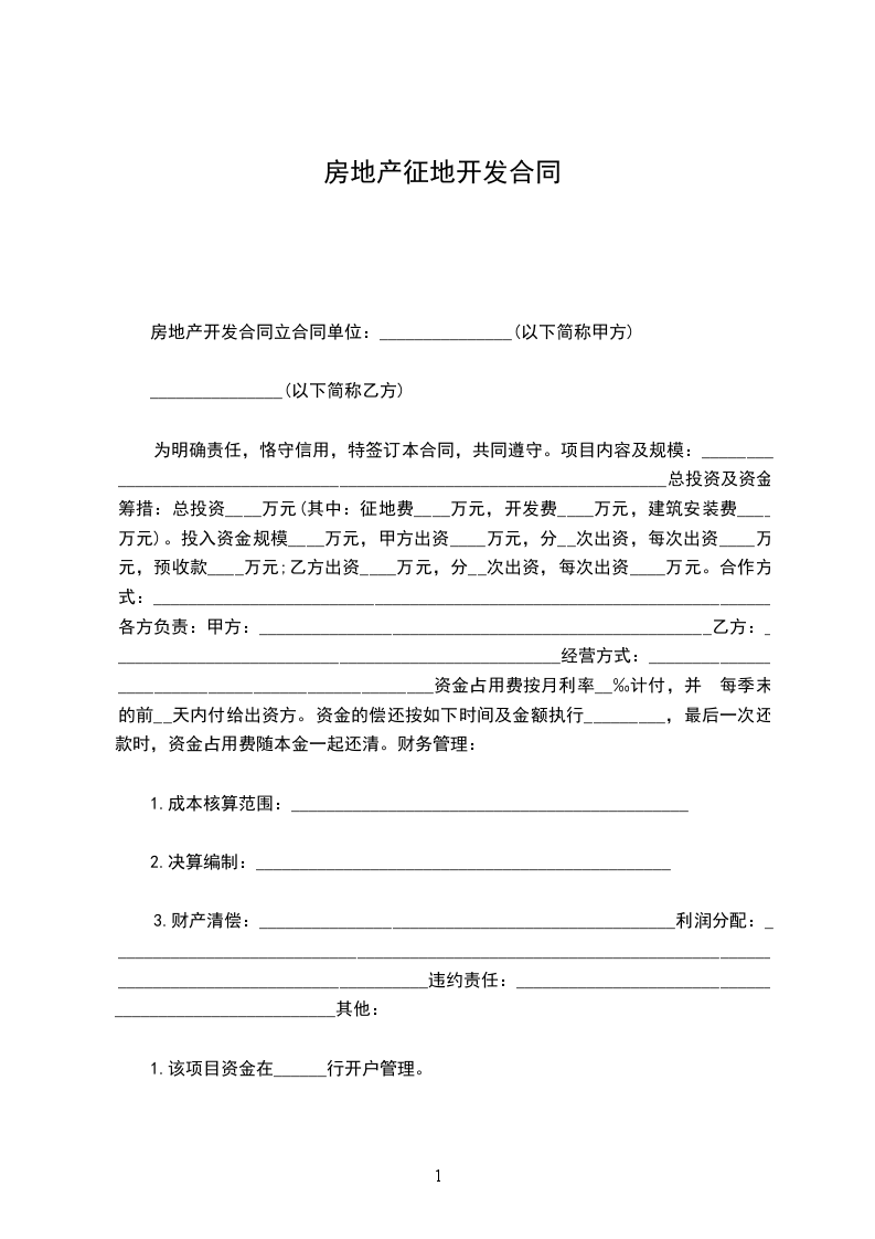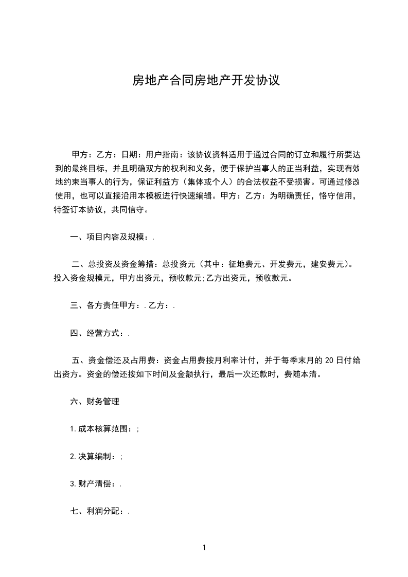 二、总投资及资金筹措:总投资_元(其中:征地费_元、开发费_元,建安费_元)。投入资金规模_元,甲方出资_元,预收款_元;乙方出资_元,预收款_元。