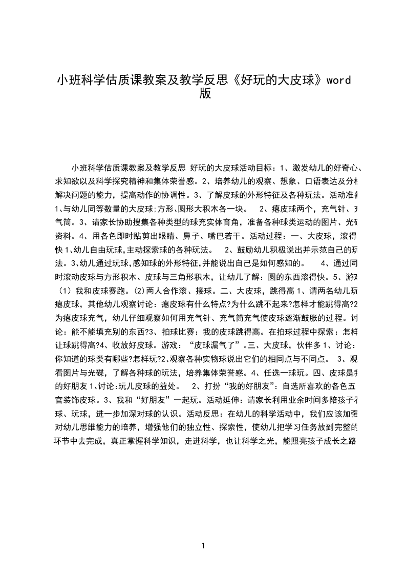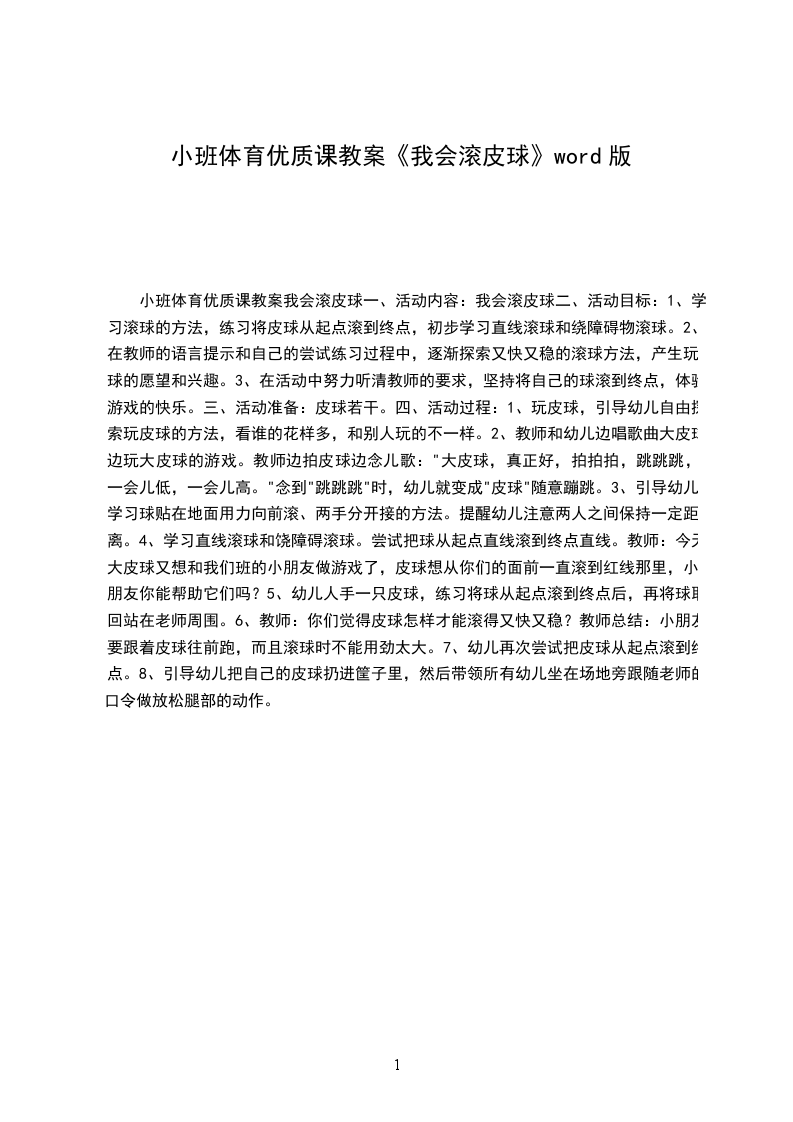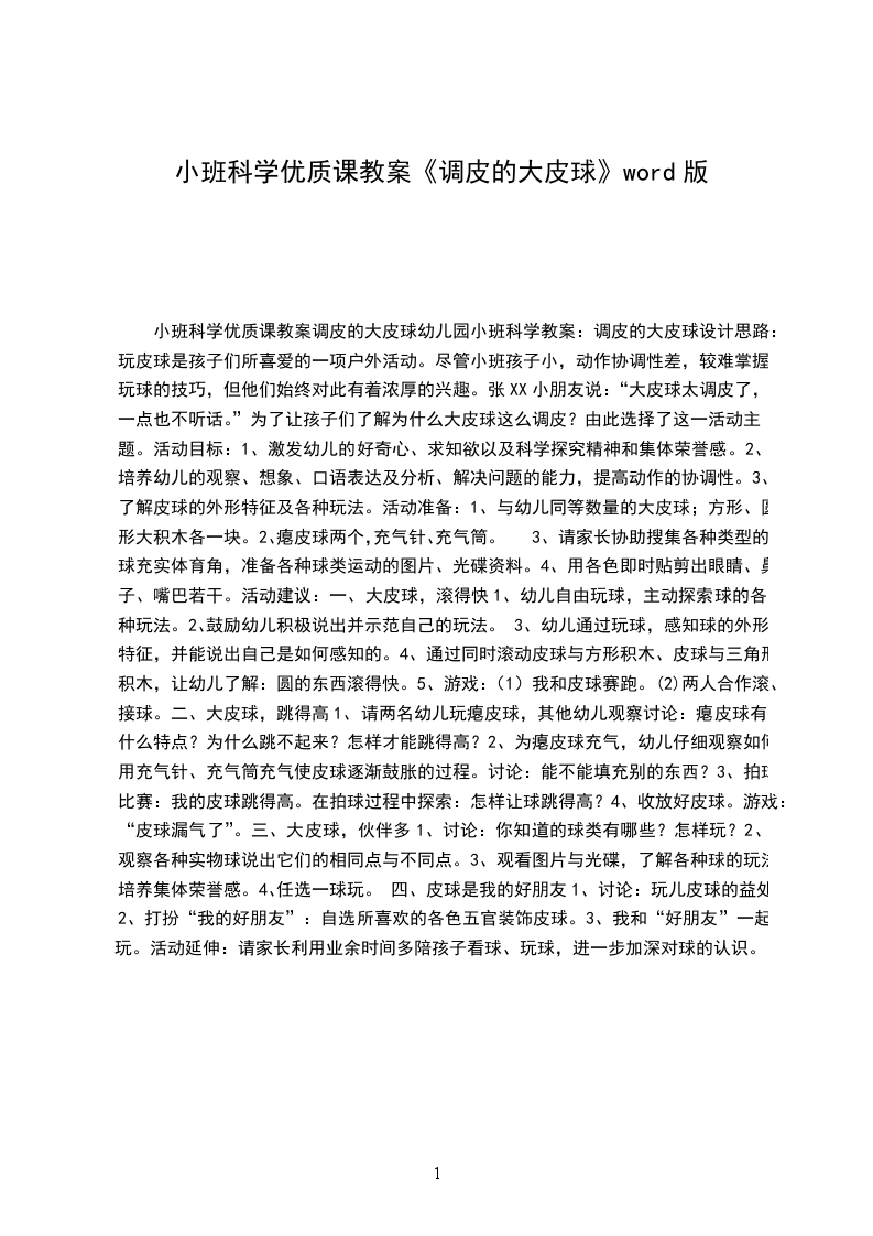 小班科学优质课教案调皮的大皮球幼儿园小班科学教案:调皮的大皮球设计思路:玩皮球是孩子们所喜爱的一项户外活动。尽管小班孩子小,动作协调性差,较难掌握玩球的技巧,但他们始终对此有着浓厚的兴趣。张XX小朋友说:“大皮球太调皮了,一点也不听话。”为了让孩子们了解为什么大皮球这么调皮?由此选择了这一活动主题。活动目标: