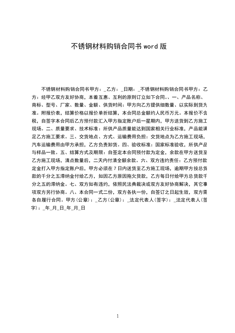 不锈钢材料购销合同书甲方:_乙方:_日期:_不锈钢材料购销合同书甲方:乙方:经甲乙双方友好协商,本着互惠、互利的原则订立如下合同。、一、产品名称、商标、型号、厂家、数量、金额、供货时间:甲方向乙方提供细数量、以实际到货为准。附报价表,结算价格以报价单折结算,本合同总金额约人民币万元。本报价不含税,自签字本合同后乙方预付款汇入甲方指定账户后一星期内,甲方送货到乙方施工现场。