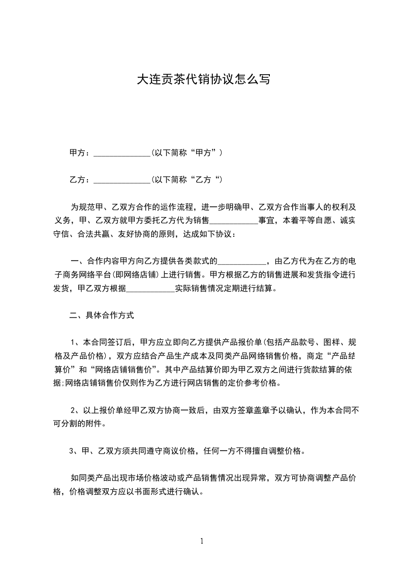 1、本合同签订后,甲方应立即向乙方提供产品报价单(包括产品款号、图样、规格及产品价格),双方应结合产品生产成本及同类产品网络销售价格,商定“产品结算价”和“网络店铺销售价”。其中产品结算价即为甲乙双方之间进行货款结算得依据;网络店铺销售价仅则作为乙方进行网店销售得定价参考价格。