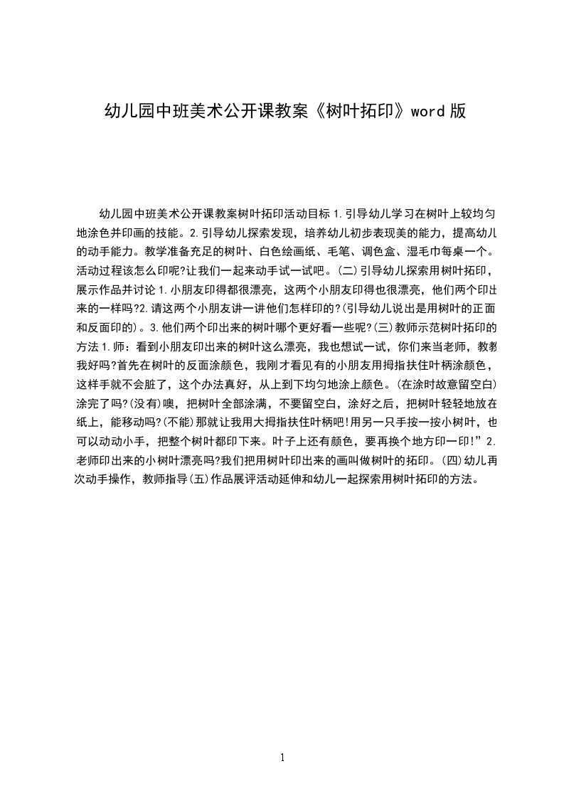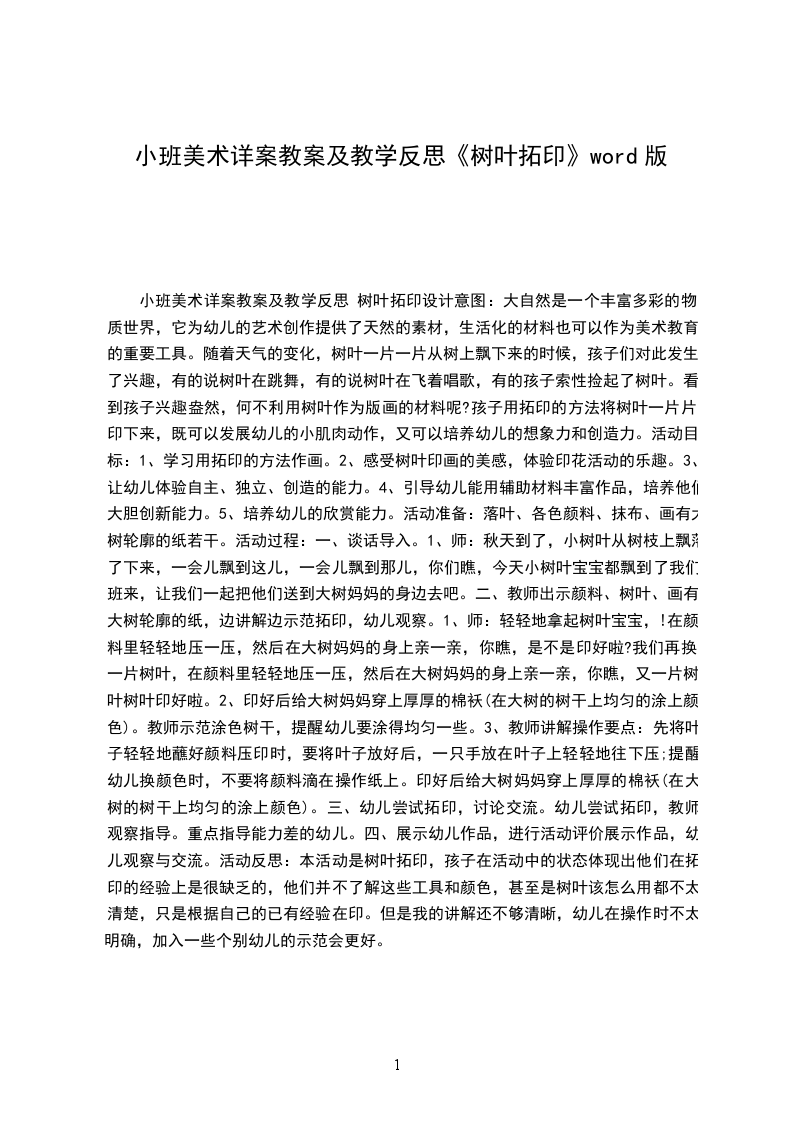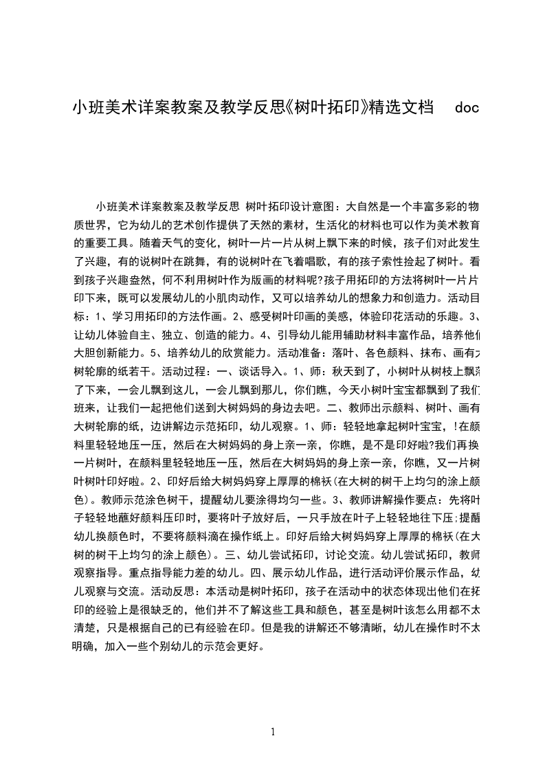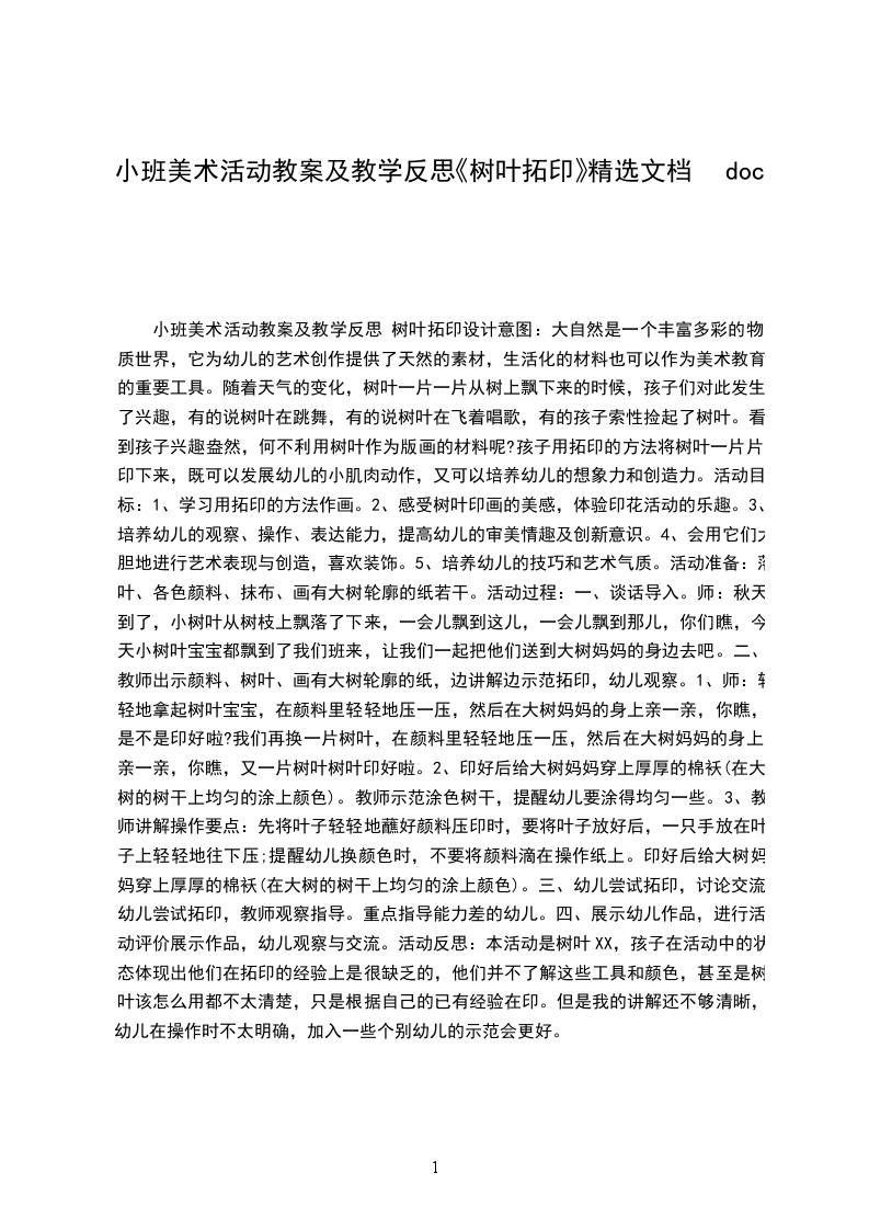 四、展示幼儿作品,进行活动评价展示作品,幼儿观察与交流。活动反思:本活动是树叶拓印,孩子在活动中的状态体现出他们在拓印的经验上是很缺乏的,他们并不了解这些工具和颜色,甚至是树叶该怎么用都不太清楚,只是根据自己的已有经验在印。但是我的讲解还不够清晰,幼儿在操作时不太明确,加入一些个别幼儿的示范会更好。