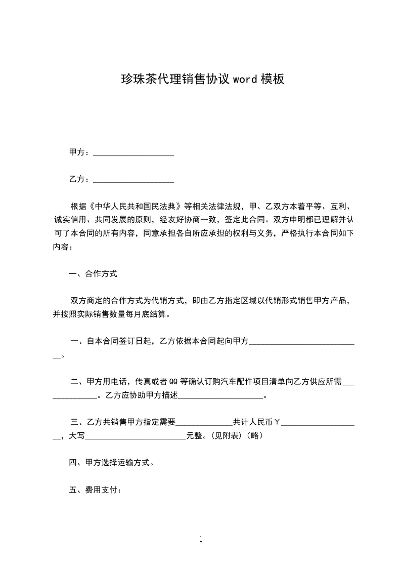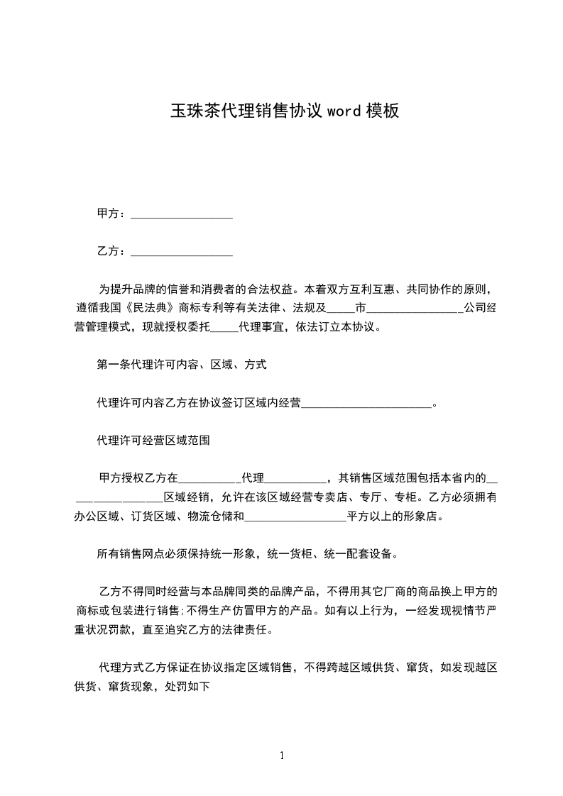 叶下珠茶代理销售协议word模板