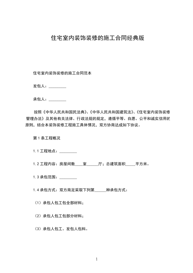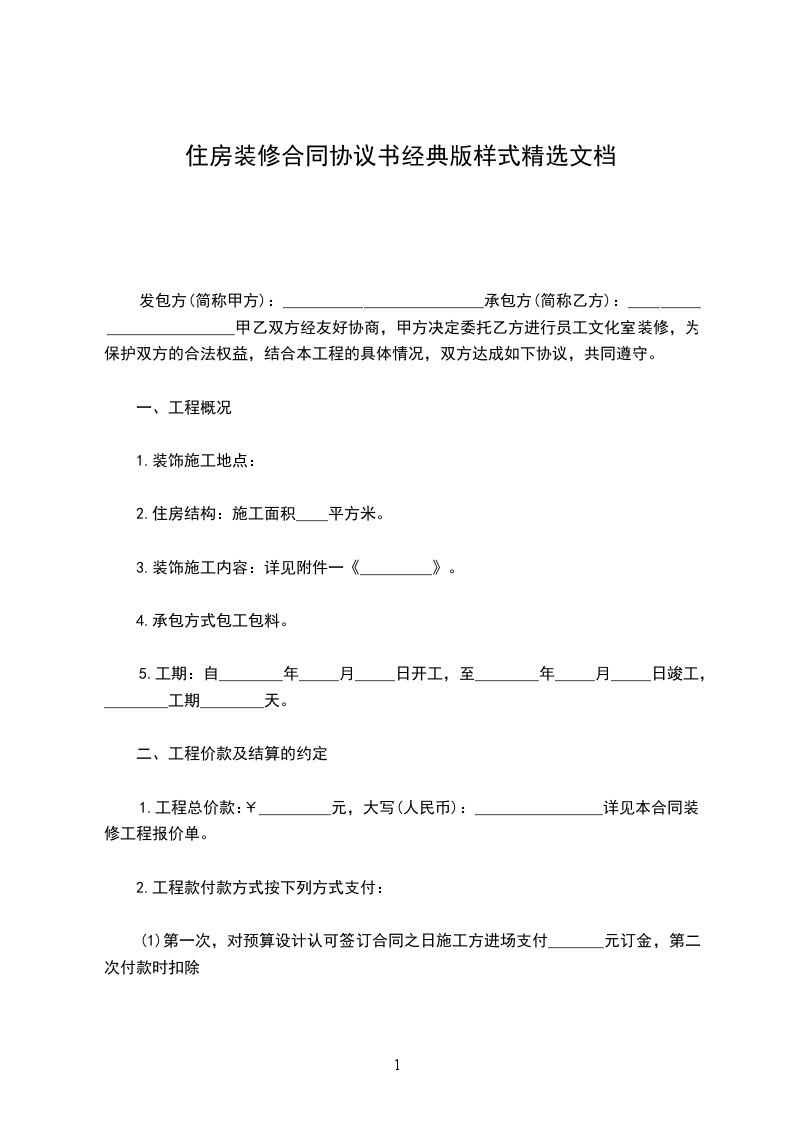 发包方(简称甲方):_________________________承包方(简称乙方):_________________________甲乙双方经友好协商,甲方决定委托乙方进行员工文化室装修,为保护双方的合法权益,结合本工程的具体情况,双方达成如下协议,共同遵守。