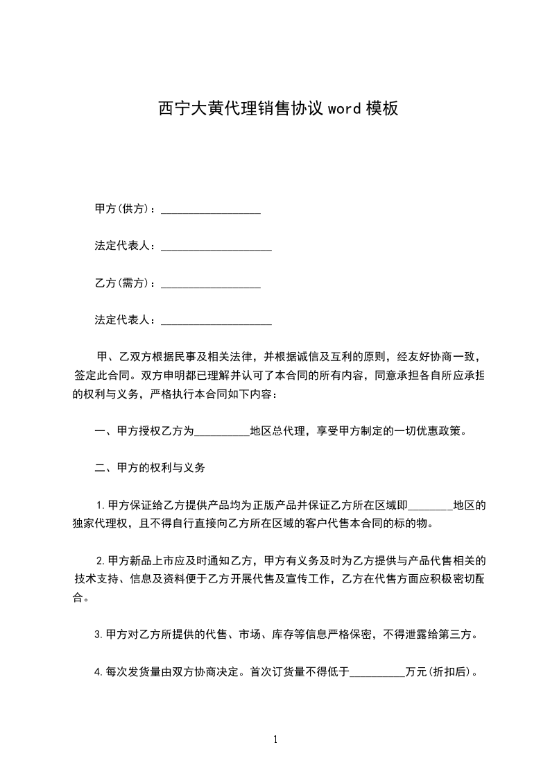 一、甲方授权乙方为__________地区总代理,享受甲方制定的一切优惠政策。