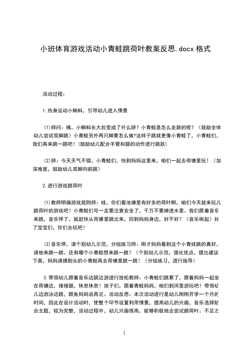 2、现在我们回家和朋友们去分享我们的美食吧!活动反思:中班是发展幼儿跳跃能力的极佳时期,而且多以双脚跳的动作为主。对于幼儿来说,模仿小动物是他们很喜欢的事情。小青蛙的外形特征、生活习惯是他们所能理解、喜欢的,赋予幼儿“小青蛙”角色来练习跳的动作,符合双脚跳动作的特点。青蛙跳活动还能满足幼儿运动、娱乐、交往、创新等多种需要,激发幼儿对体育活动的兴趣,促进幼儿以体能为主的身心和谐发展。