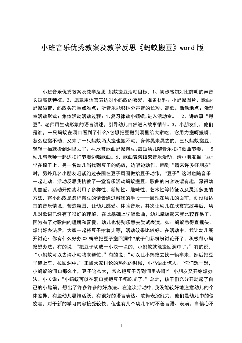 三、结束语小朋友们歌曲学得快、动作表演的好!我们应该学习小蚂蚁互相帮助、团结友爱的精神,平时要主动帮助有困难的小朋友,小朋友们能做到吗?(能)小朋友们今天真棒!我们一起来夸夸自己吧!(师生同说口号、同做手势)到时间了,我们这群小蚂蚁该去外面运粮食了(全体起立,整齐地快步走出去)活动主题音乐活动蚂蚁搬豆作者于静单位唐山市唐海县第二幼儿园