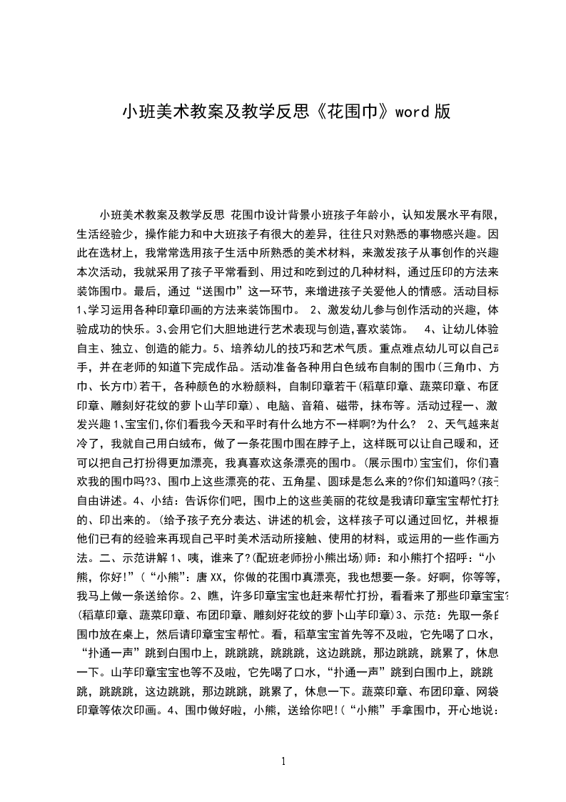 小班美术教案及教学反思 花围巾设计背景小班孩子年龄小,认知发展水平有限,生活经验少,操作能力和中大班孩子有很大的差异,往往只对熟悉的事物感兴趣。因此在选材上,我常常选用孩子生活中所熟悉的美术材料,来激发孩子从事创作的兴趣。本次活动,我就采用了孩子平常看到、用过和吃到过的几种材料,通过压印的方法来装饰围巾。最后,通过“送围巾”这一环节,来增进孩子关爱他人的情感。活动目标