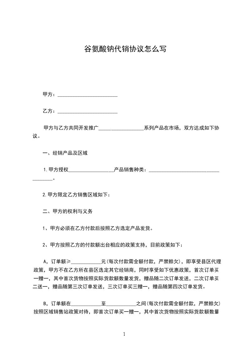 B,订单额在____________至____________之间(每次付款需全额付款,严禁赊欠)按照区域销售站政策对待,即首次订单买一赠一,其中首次货物按照实际货款额数量发货,赠品随二次订单发送,二次订单买二送一,赠品随第三次订单发送,三次订单买三赠一,赠品随第四次订单发货。甲方可以在乙方所在县区建立新的销售站。