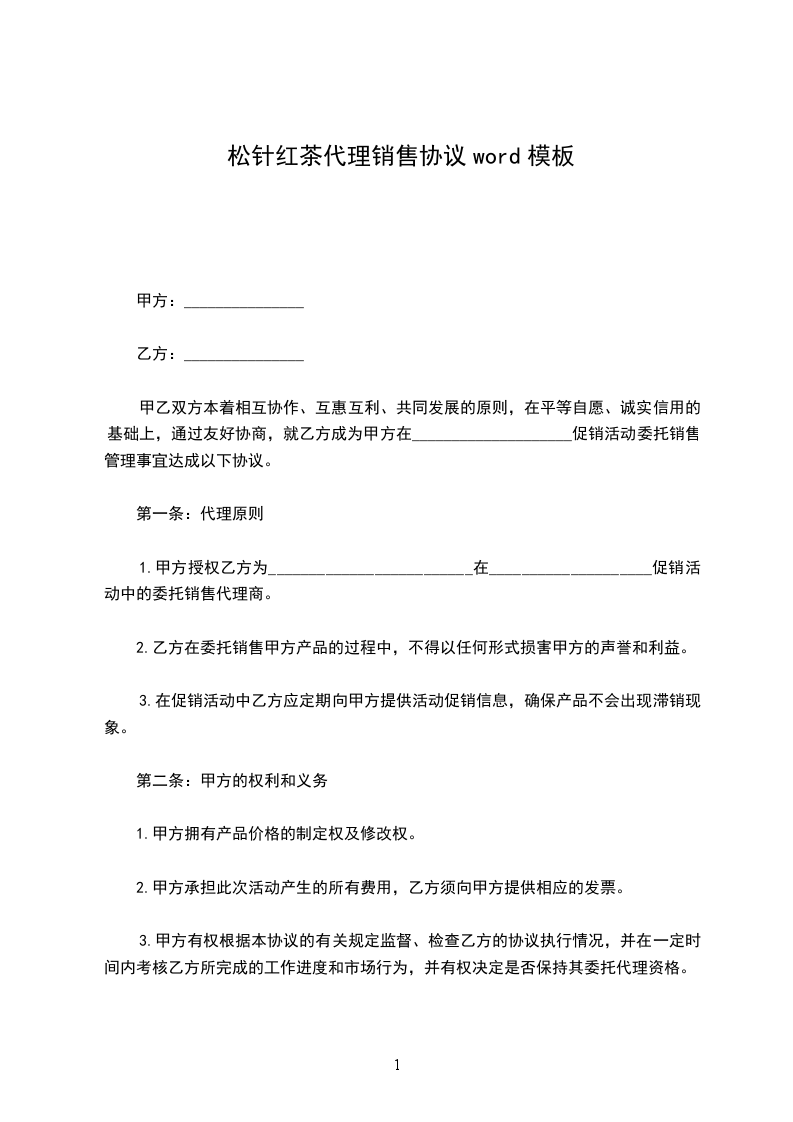 为规范甲、乙双方合作的运作流程,进一步明确甲、乙双方合作当事人的权利及义务,甲、乙双方就甲方委托乙方代为销售____________事宜,本着平等自愿、诚实守信、合法共赢、友好协商的原则,达成如下协议: