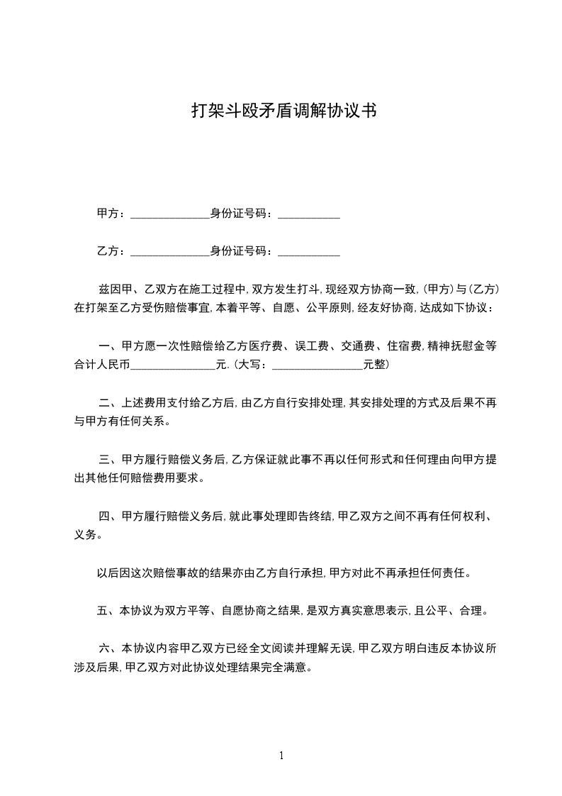 兹因甲、乙双方在施工过程中,双方发生打斗,现经双方协商一致,(甲方)与(乙方)在打架至乙方受伤赔偿事宜,本着平等、自愿、公平原则,经友好协商,达成如下协议: