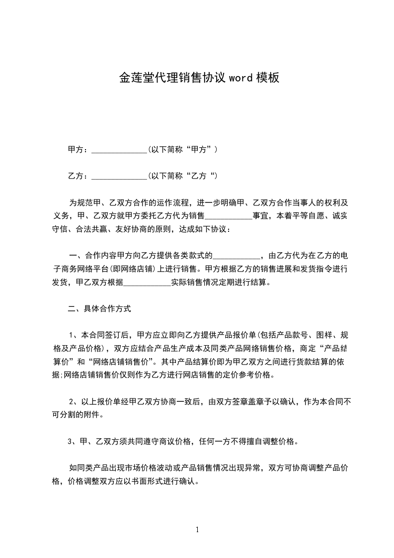 为规范甲、乙双方合作的运作流程,进一步明确甲、乙双方合作当事人的权利及义务,甲、乙双方就甲方委托乙方代为销售____________事宜,本着平等自愿、诚实守信、合法共赢、友好协商的原则,达成如下协议:
