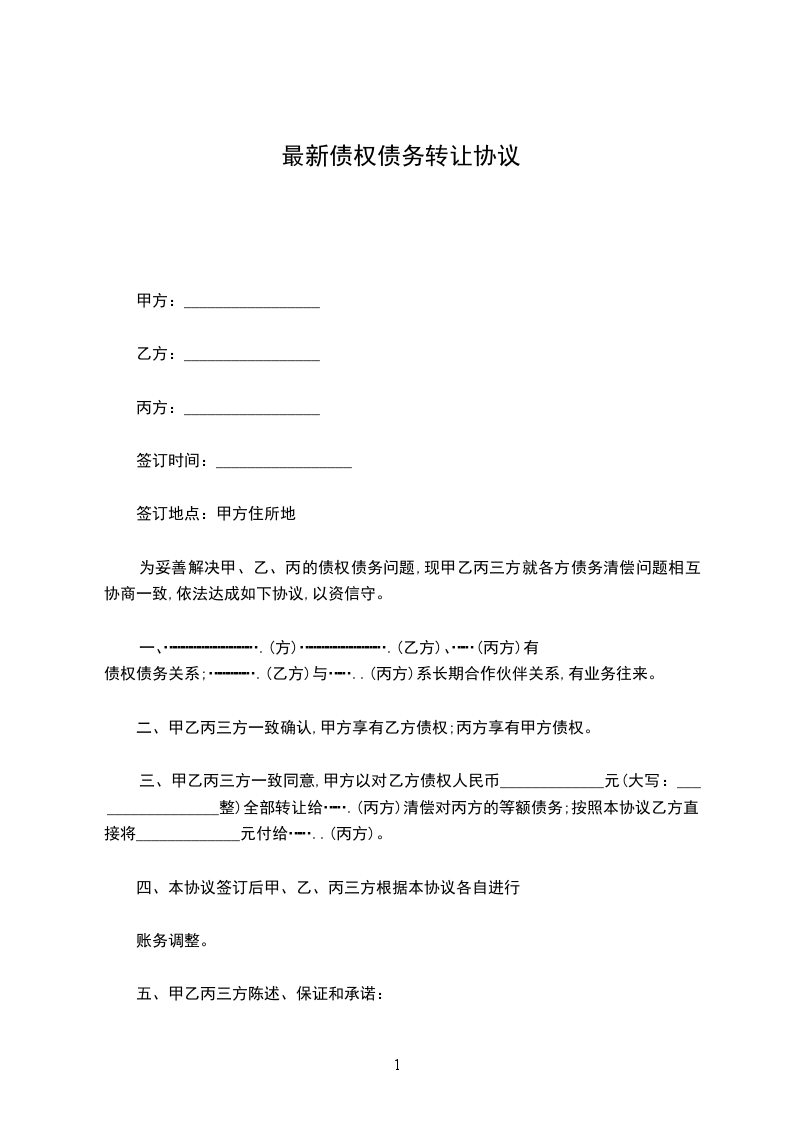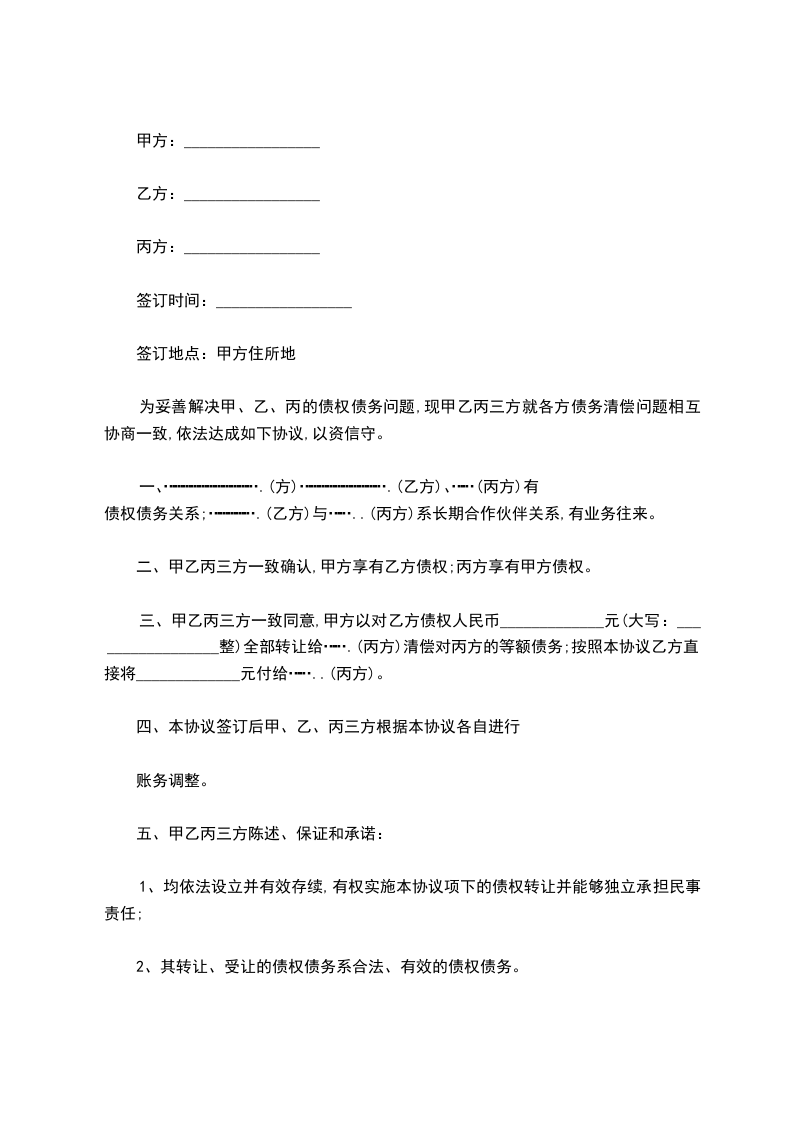 三、甲乙丙三方一致同意,甲方以对乙方债权人民币_____________元(大写:_________________整)全部转让给…….(丙方)清偿对丙方的等额债务;按照本协议乙方直接将_____________元付给……..(丙方)。