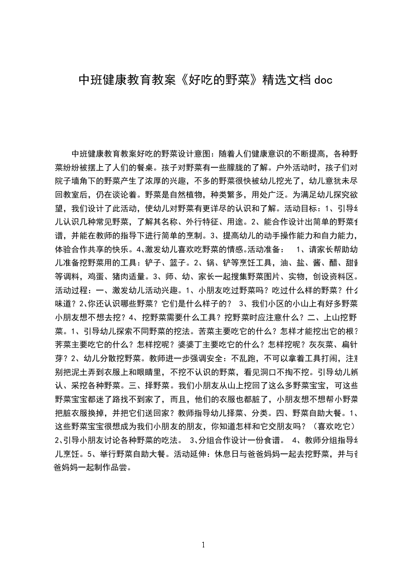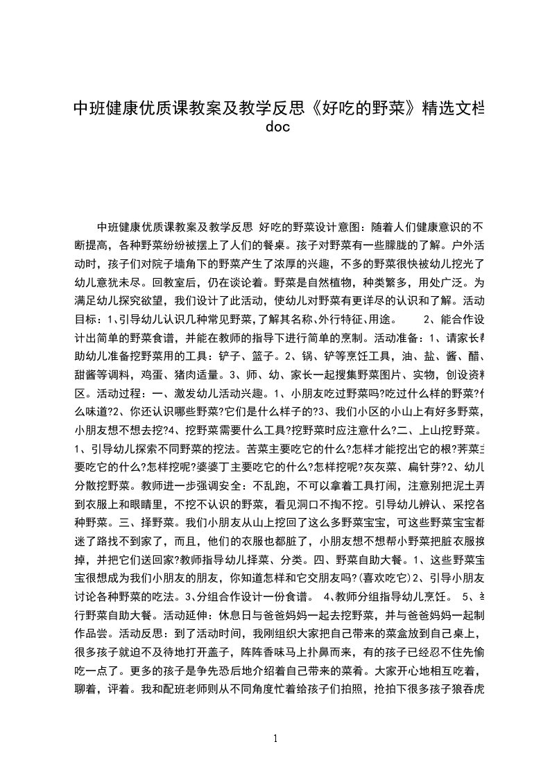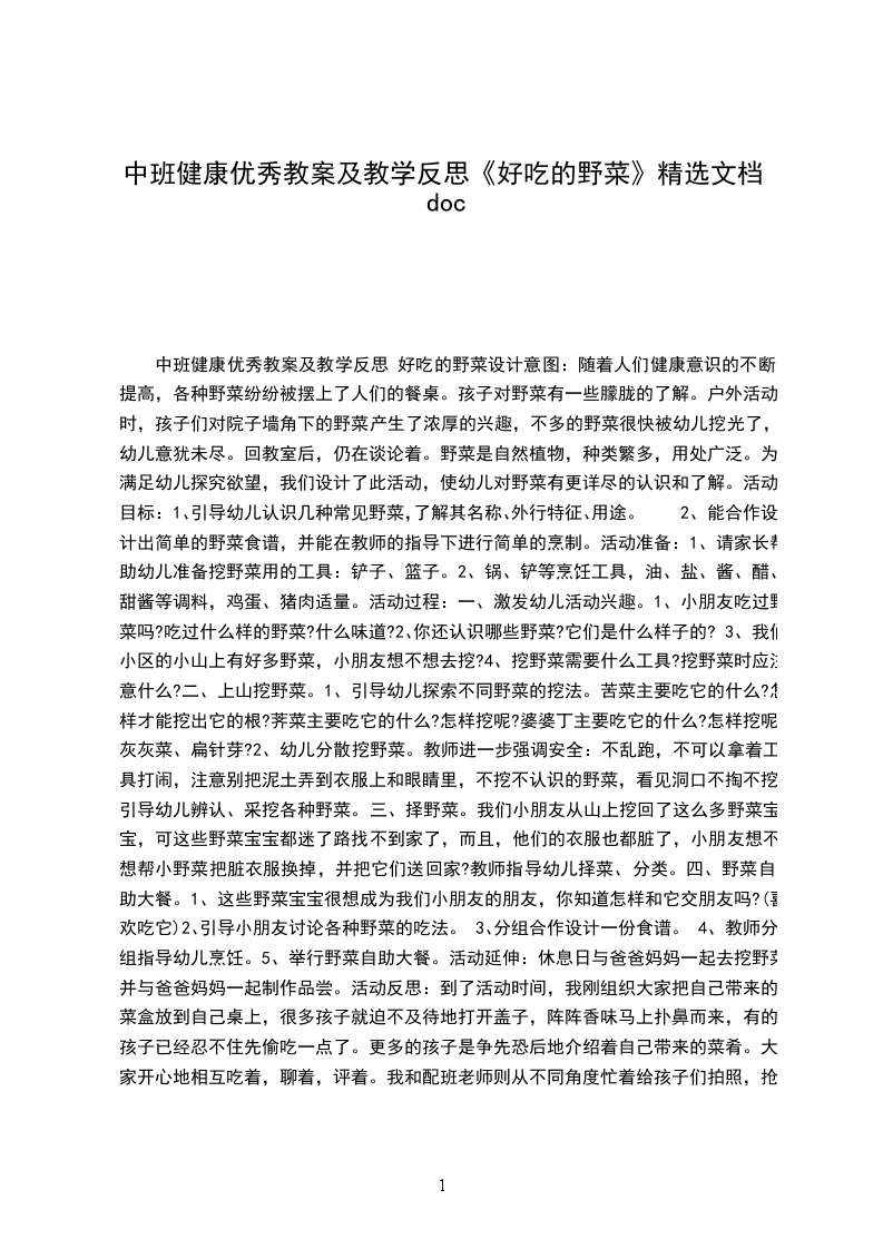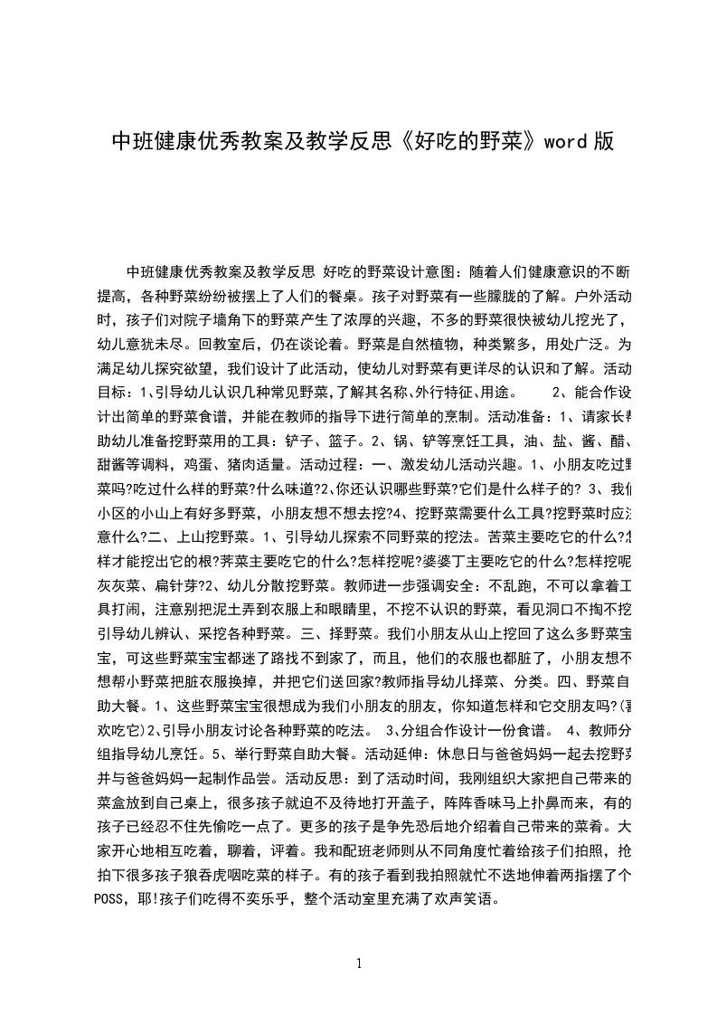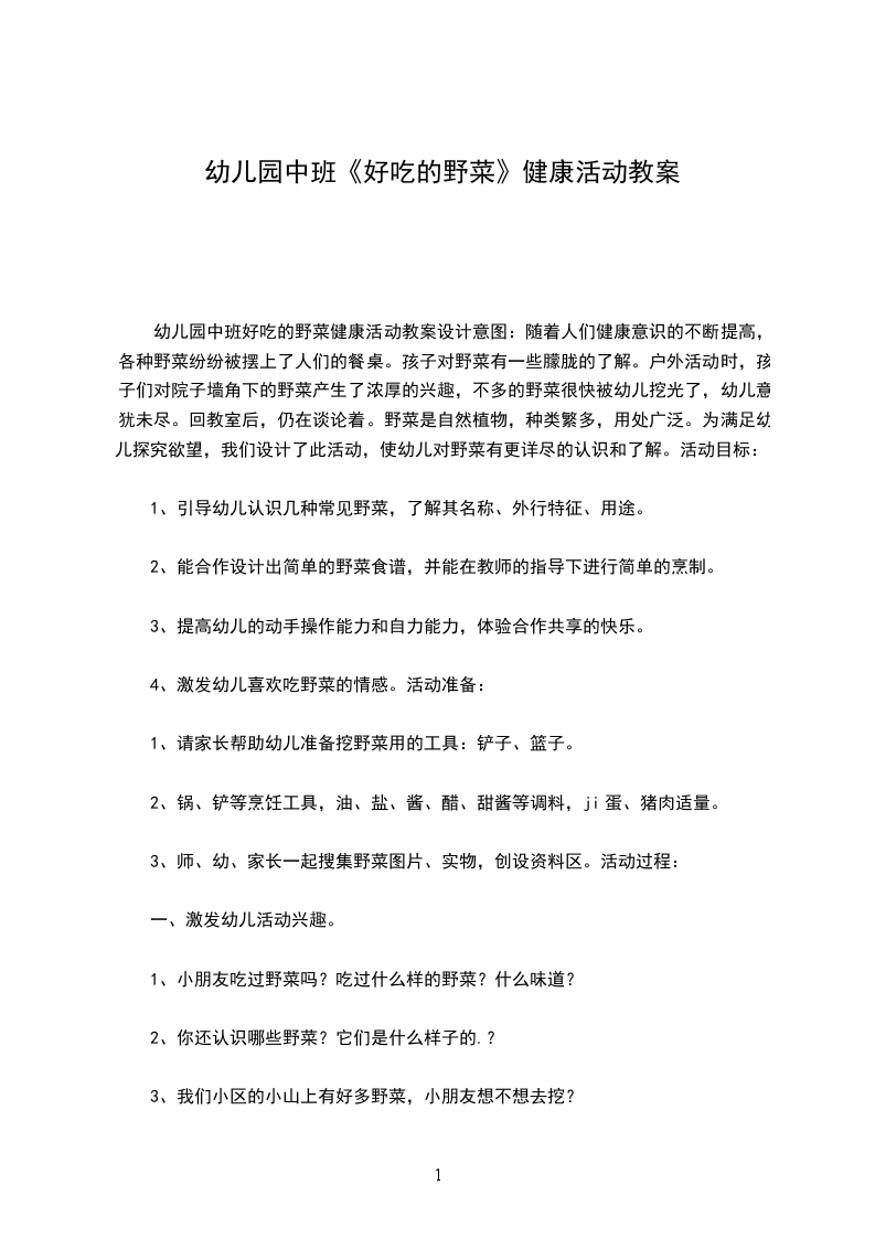 中班健康优质课教案及教学反思 好吃的野菜设计意图:随着人们健康意识的不断提高,各种野菜纷纷被摆上了人们的餐桌。孩子对野菜有一些朦胧的了解。户外活动时,孩子们对院子墙角下的野菜产生了浓厚的兴趣,不多的野菜很快被幼儿挖光了,幼儿意犹未尽。回教室后,仍在谈论着。野菜是自然植物,种类繁多,用处广泛。为满足幼儿探究欲望,我们设计了此活动,使幼儿对野菜有更详尽的认识和了解。活动目标: