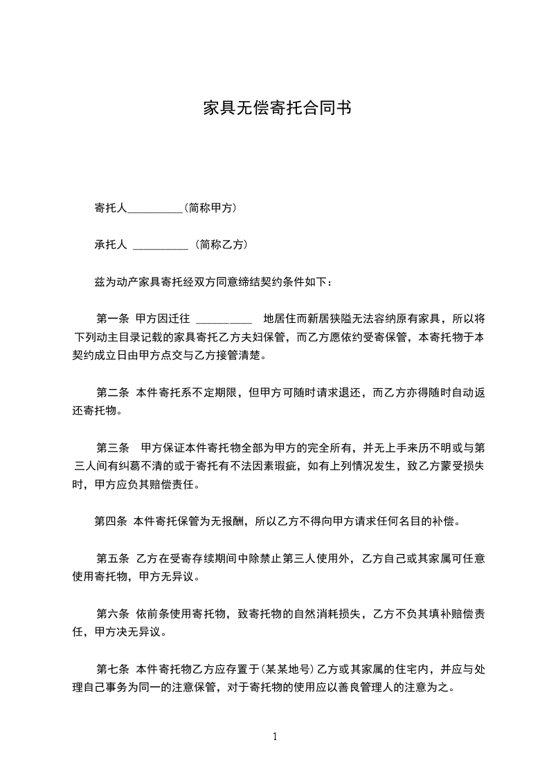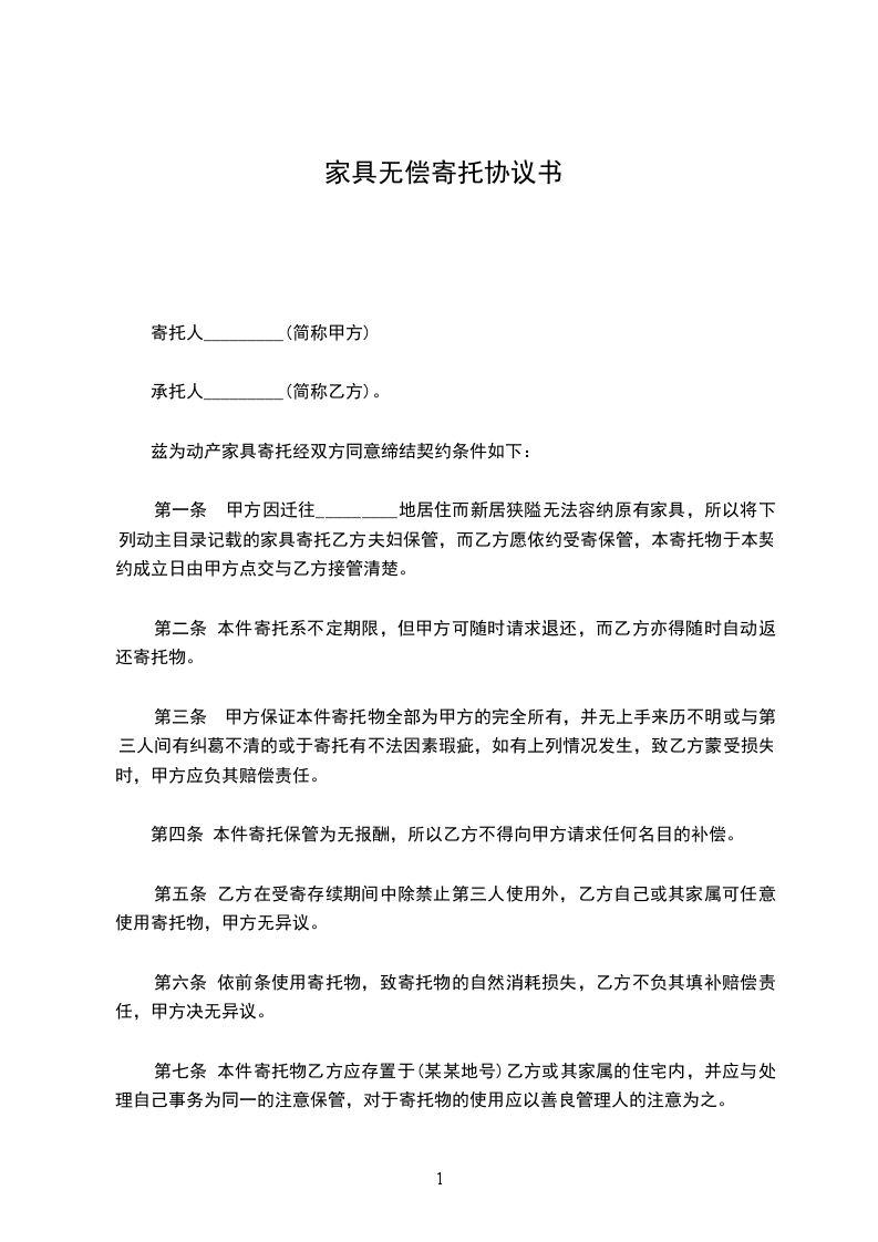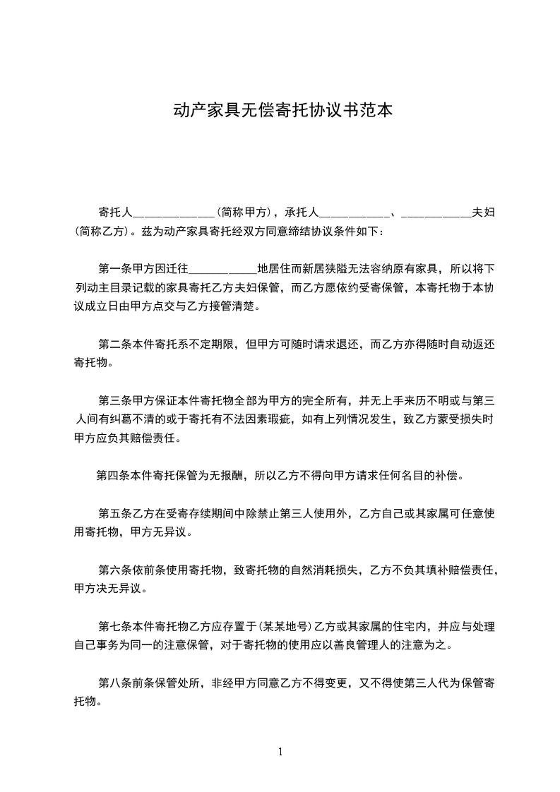 第一条甲方因迁往____________地居住而新居狭隘无法容纳原有家具,所以将下列动主目录记载的家具寄托乙方夫妇保管,而乙方愿依约受寄保管,本寄托物于本协议成立日由甲方点交与乙方接管清楚。