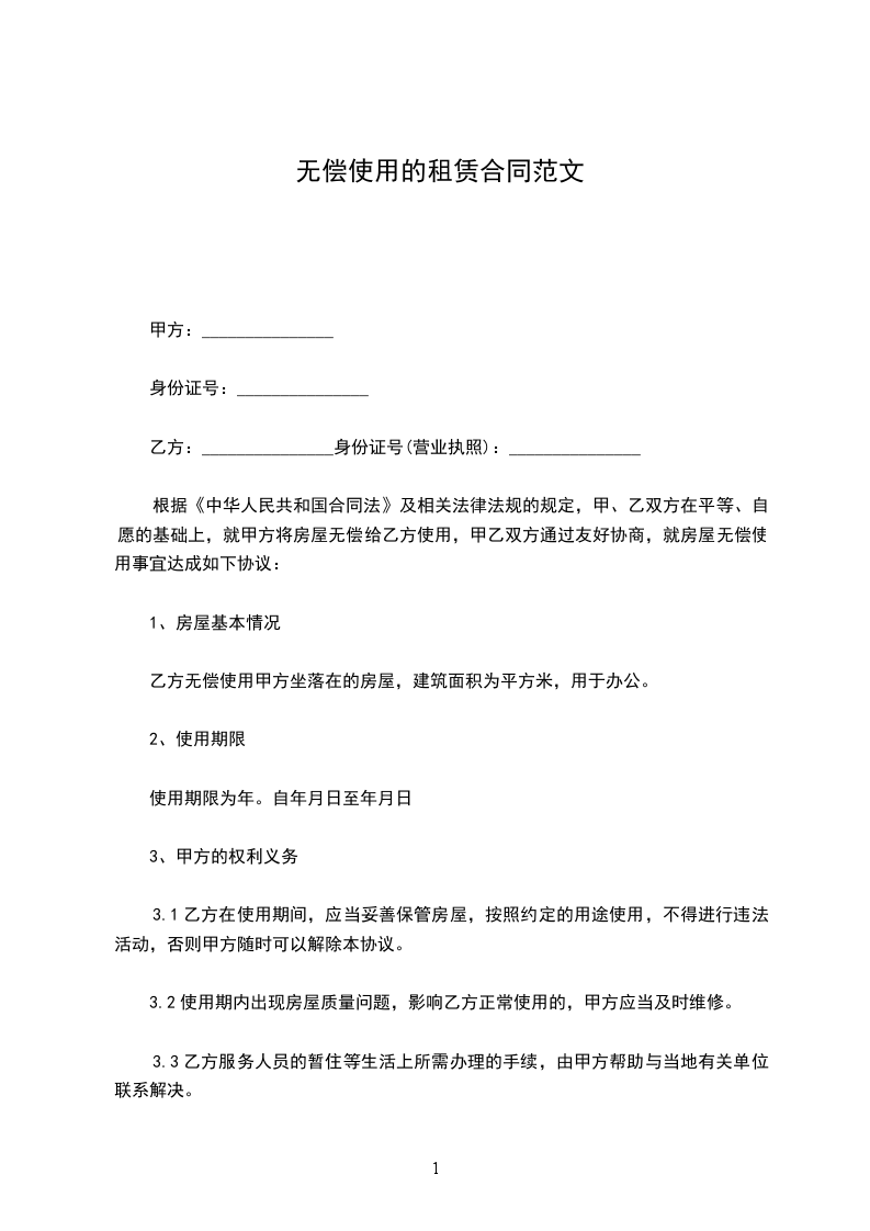乙方无偿使用甲方坐落在的房屋,建筑面积为_____平方米,用于办公。