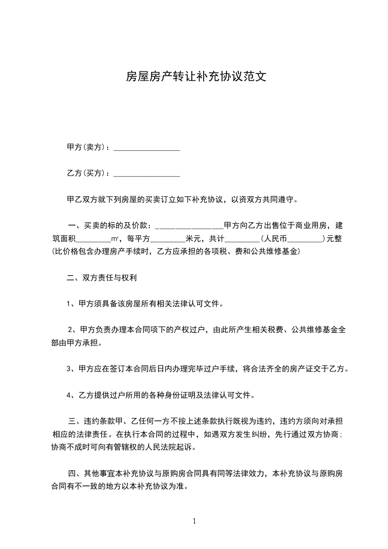 一、买卖的标的及价款:_________________甲方向乙方出售位于商业用房,建筑面积_________㎡,每平方_________米元,共计_________(人民币_________)元整。(比价格包含办理房产手续时,乙方应承担的各项税、费和公共维修基金)