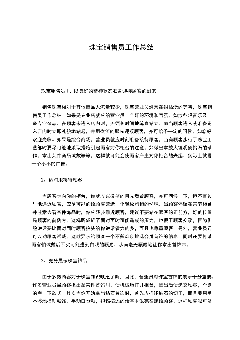 顾客所了解的珠宝知识越多,其买后感受就会得到更多的满足。当一位女士戴上新买的一枚钻戒去上班,总是希望引起同事们的注意。当别人看到这枚钻戒后,她便会把所知道的有关钻石知识滔滔不绝地讲一遍,充分得到拥有一颗钻石的精神享受,同时她也在为你做广告,工作总结《珠宝销售员工作总结》()。常言道;满意的顾客是最好的广告,影响力最强的广告是其周围的人。但如果你不管顾客是否愿意听,不分时机的讲解珠宝知识,也会招来顾客的厌烦。因此时机很重要,在销售的整个过程中抓住机会,尤其是当顾客提出质疑时。