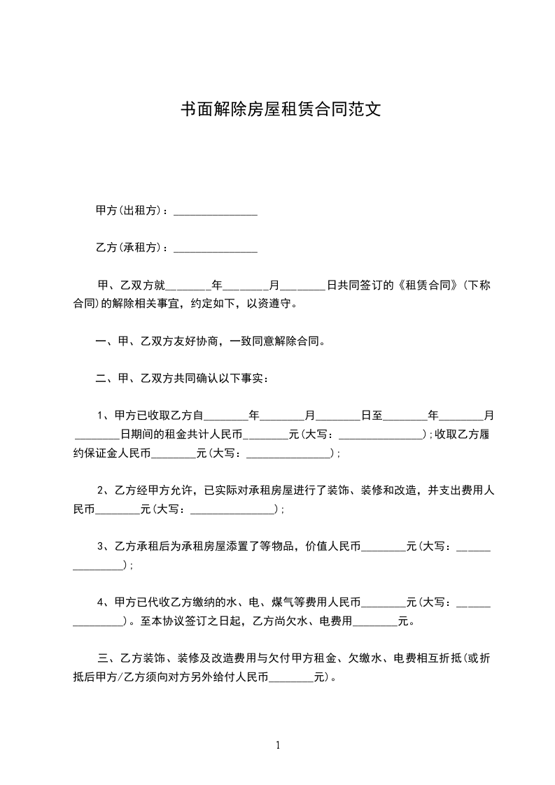 一、甲、乙双方友好协商,一致同意解除合同。