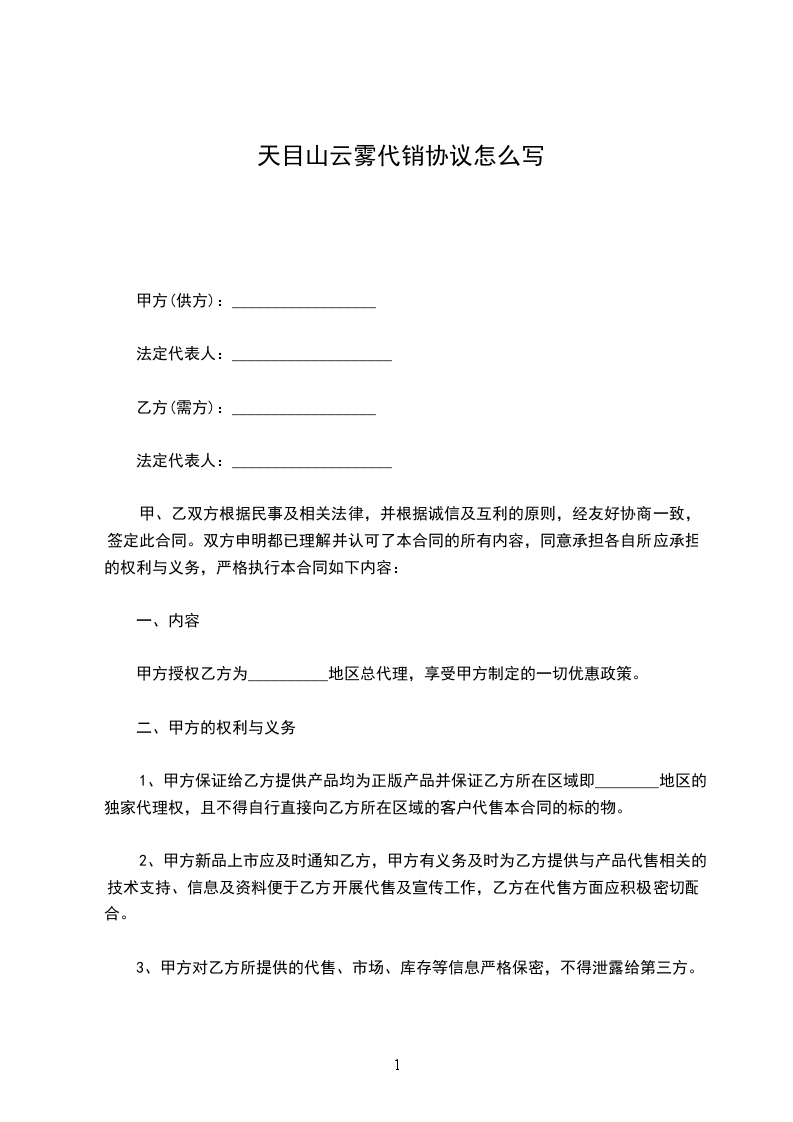 1、甲方保证给乙方提供产品均为正版产品并保证乙方所在区域即________地区的独家代理权,且不得自行直接向乙方所在区域的客户代售本合同的标的物。