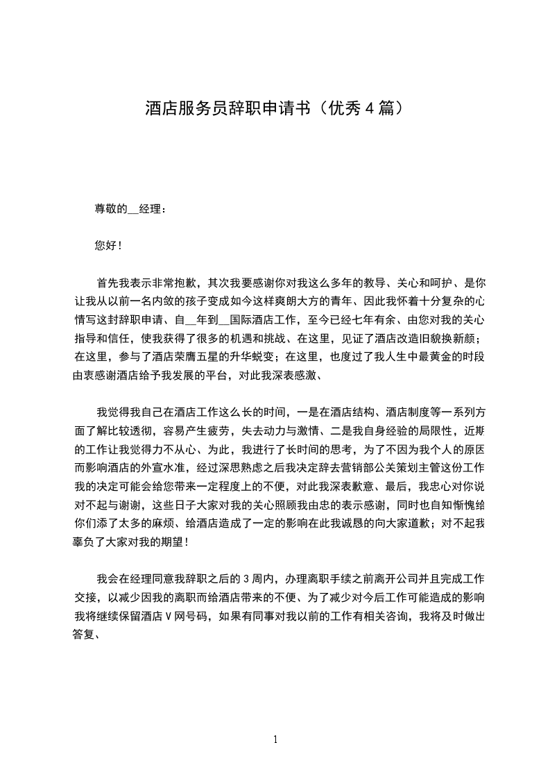 酒店服务员辞职申请书篇三