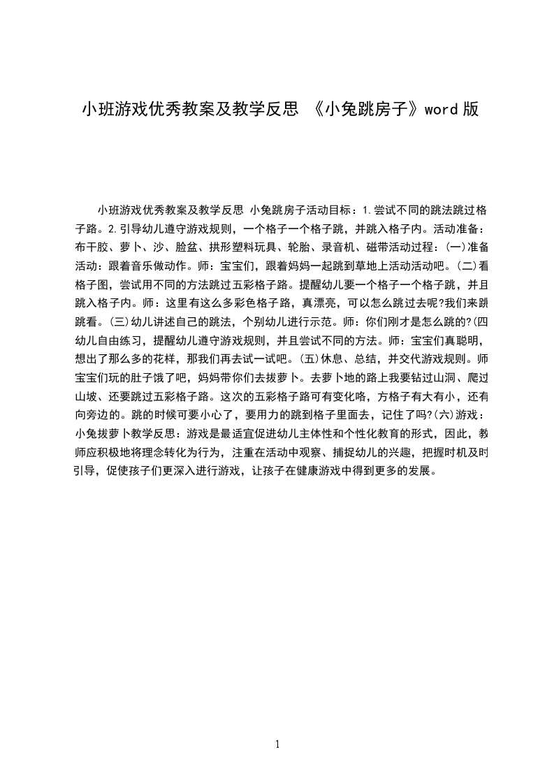 小班游戏活动教案小兔跳房子活动目标:1尝试不同的跳法跳过格子路。2引导幼儿遵守游戏规则,一个格子一个格子跳,并跳入格子内。3通过游戏,体验健康活动的乐趣。活动准备:布干胶、萝卜、沙、脸盆、拱形塑料玩具、轮胎、录音机、磁带
