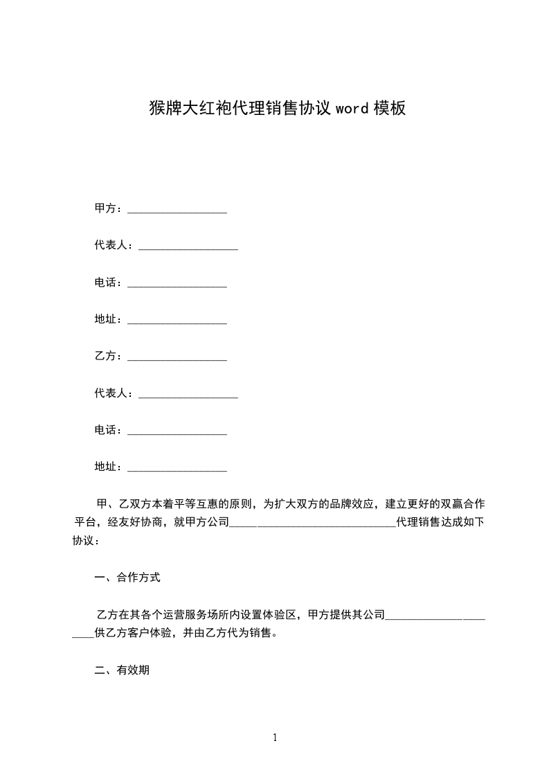 猴牌大红袍代理销售协议word模板