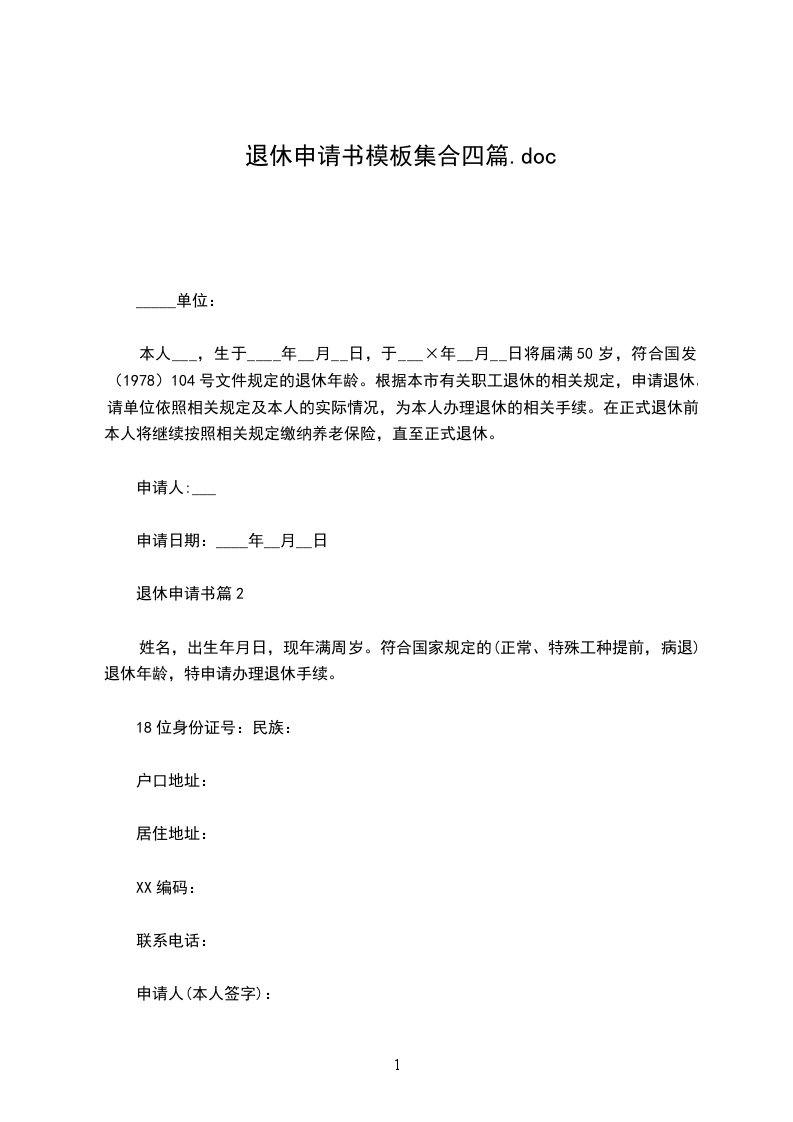 本人___,生于__年__月__日,于____年__月__日将届满50岁,符合国发(1978)104号文件规定的退休年龄。根据本市有关职工退休的相关规定,申请退休。请单位依照相关规定及本人的实际情况,为本人办理退休的相关手续。在正式退休前,本人将继续按照相关规定缴纳养老保险,直至正式退休。