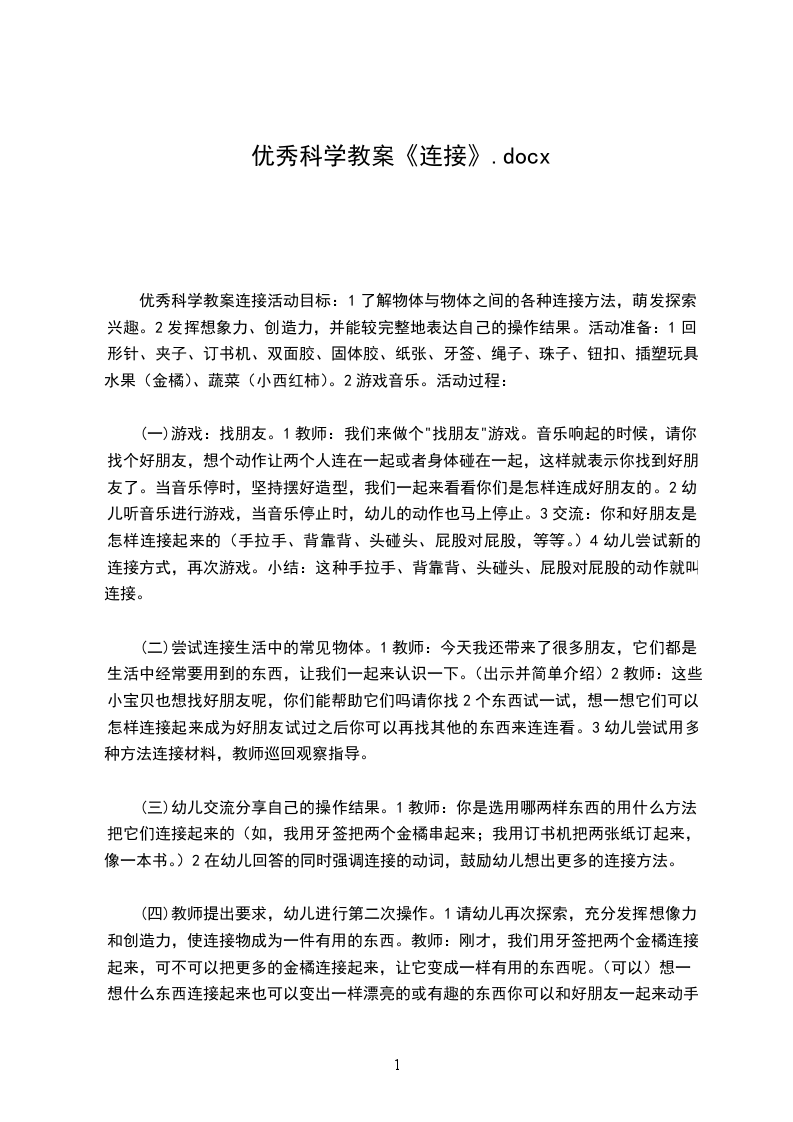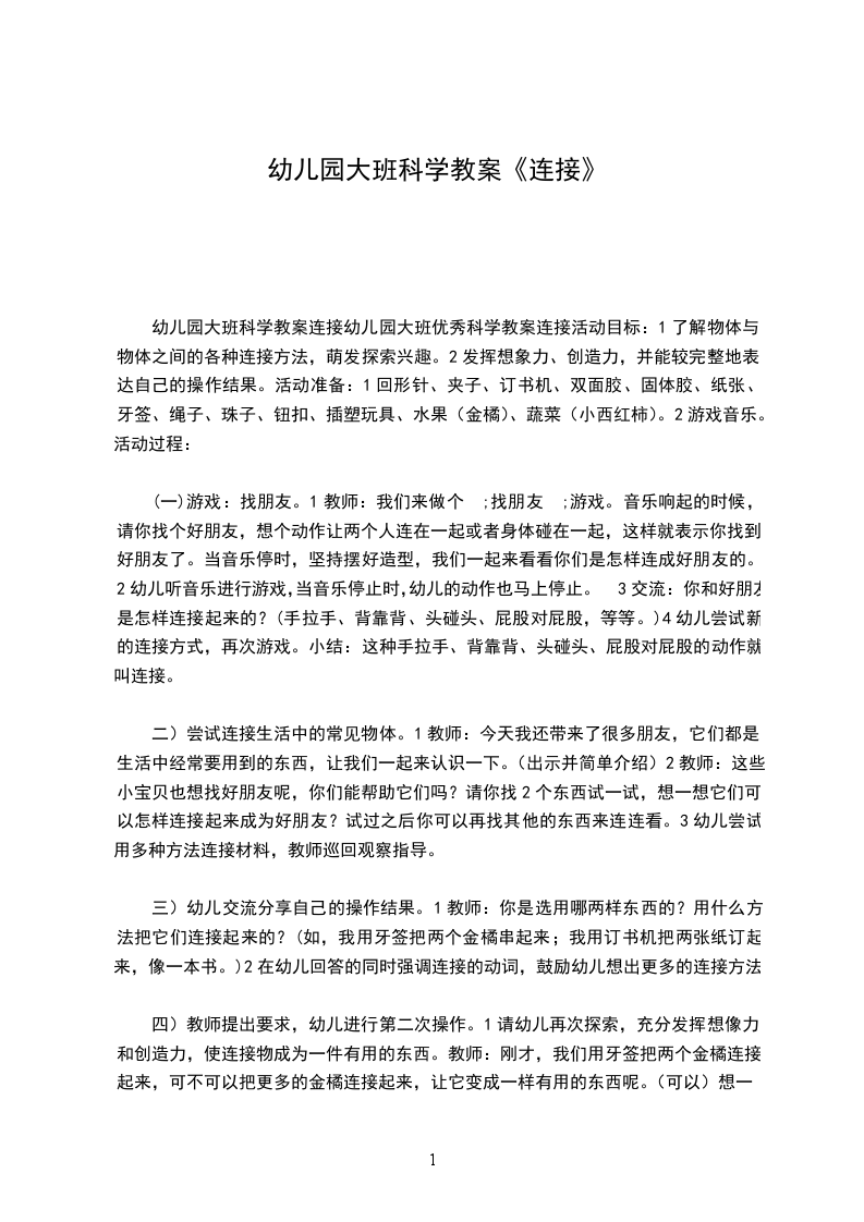 幼儿园大班优秀科学教案连接活动目标:1了解物体与物体之间的各种连接方法,萌发探索兴趣。2发挥想象力、创造力,并能较完整地表达自己的操作结果。活动准备:1回形针、夹子、订书机、双面胶、固体胶、纸张、牙签、绳子、珠子、钮扣、插塑玩具、水果(金橘)、蔬菜(小西红柿)。2游戏音乐。