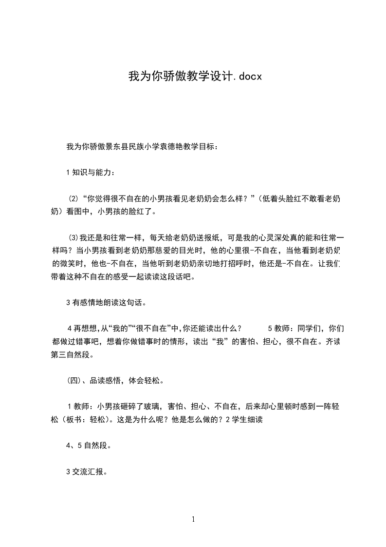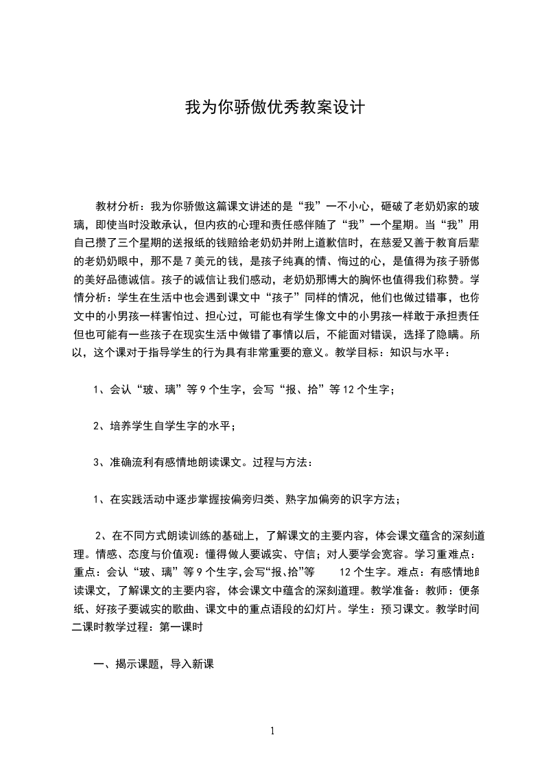 我为你骄傲教学设计教学目标:根据文章内容和学生的理解水平,我确定了以下教学目标: