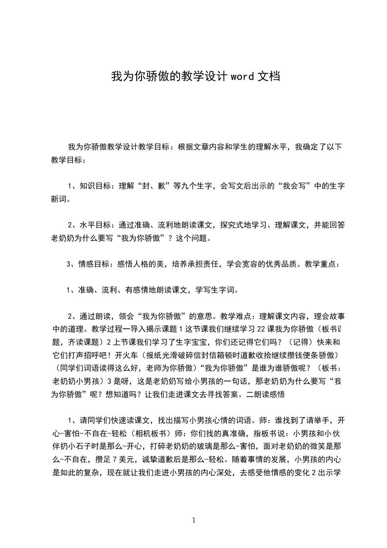 2、通过朗读,领会“我为你骄傲”的意思。教学难点:理解课文内容,理会故事中的道理。教学过程一导入揭示课题1这节课我们继续学习22课我为你骄傲(板书课题,齐读课题)2上节课我们学习了生字宝宝,你们还记得它们吗?(记得)快来和它们打声招呼吧!开火车(报纸光滑破碎信封信箱顿时道歉收拾继续攒钱便条骄傲)(同学们词语读得这么好,老师为你骄傲)“我为你骄傲”是谁为谁骄傲呢?(板书:老奶奶小男孩)3是呀,这是老奶奶写给小男孩的一句话,那老奶奶为什么要写“我为你骄傲”呢?想知道吗?让我们走进课文去寻找答案。二朗读感悟