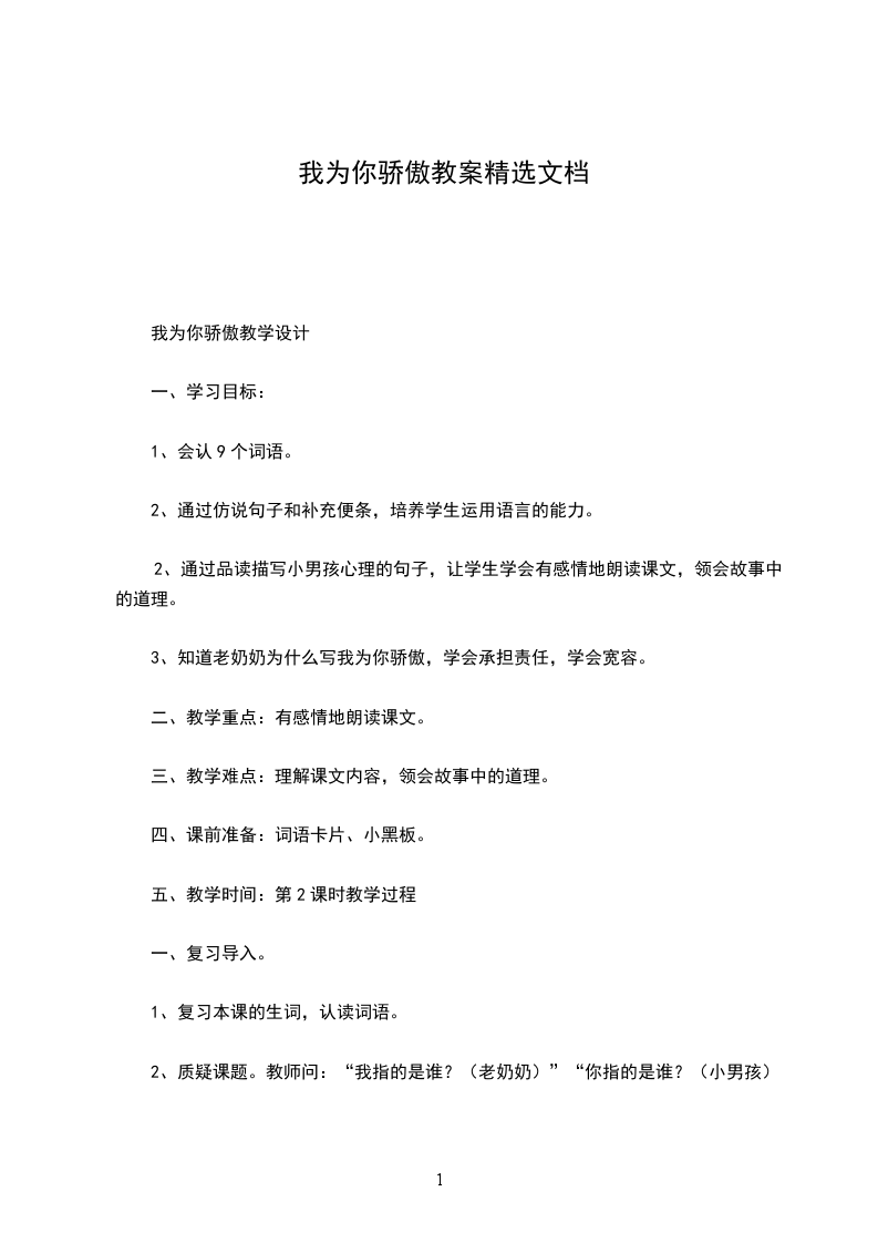 2、水平目标:通过准确、流利地朗读课文,探究式地学习、理解课文,并能回答老奶奶为什么要写“我为你骄傲”?这个问题。