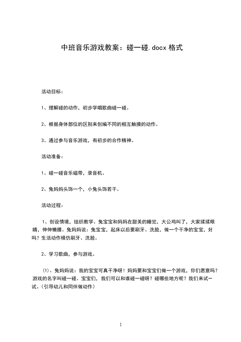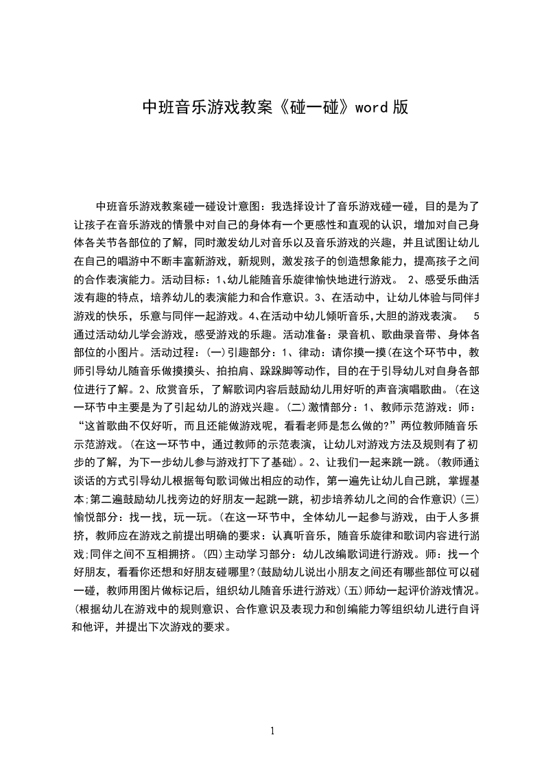 中班音乐游戏教案碰一碰设计意图:我选择设计了音乐游戏碰一碰,目的是为了让孩子在音乐游戏的情景中对自己的身体有一个更感性和直观的认识,增加对自己身体各关节各部位的了解,同时激发幼儿对音乐以及音乐游戏的兴趣,并且试图让幼儿在自己的唱游中不断丰富新游戏,新规则,激发孩子的创造想象能力,提高孩子之间的合作表演能力。活动目标: