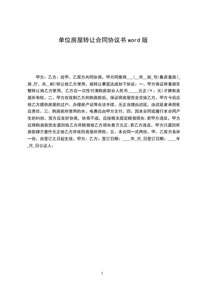 甲方:乙方:经甲、乙双方共同协商,甲方同意将___(__市__街_号)集资套房(_房_厅,共__M2)转让给乙方使用,就转让事宜达成如下协议: