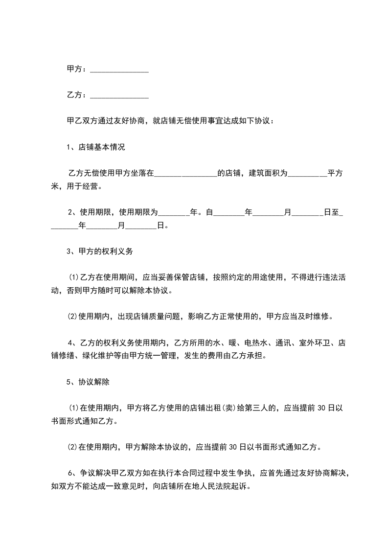 甲乙双方通过友好协商,就店铺无偿使用事宜达成如下协议: